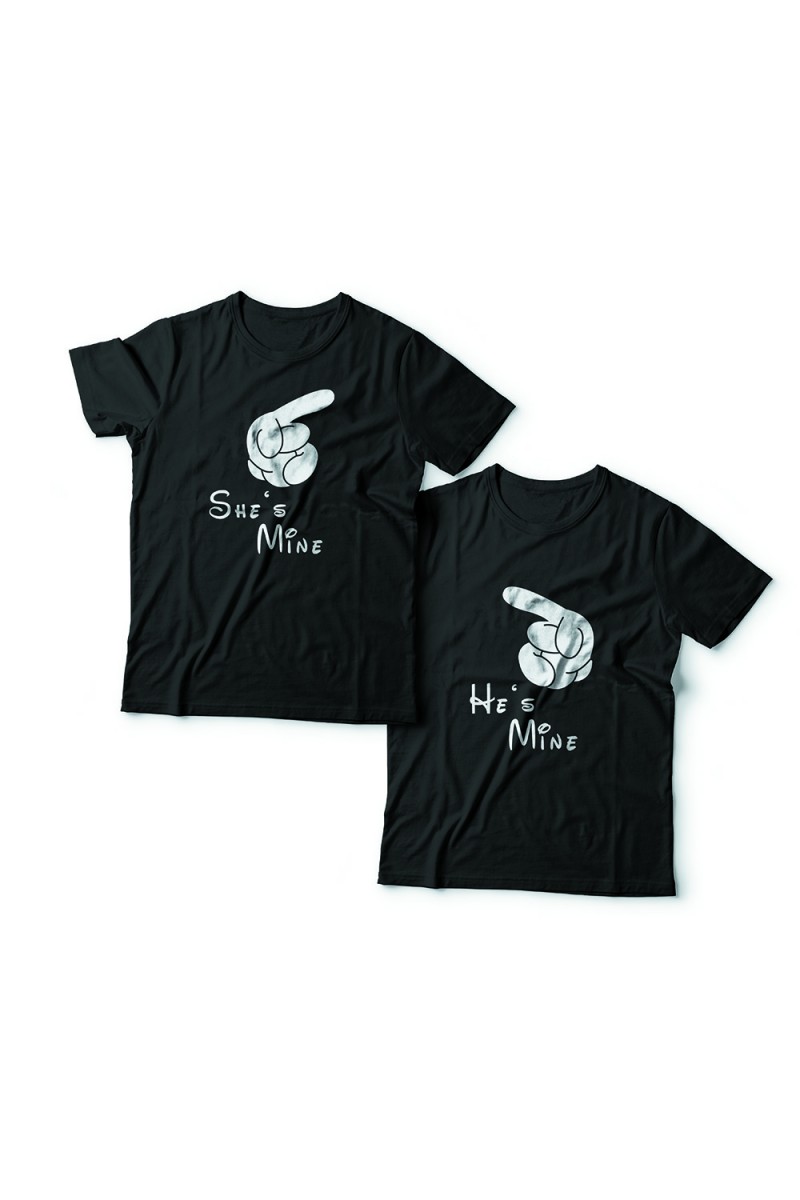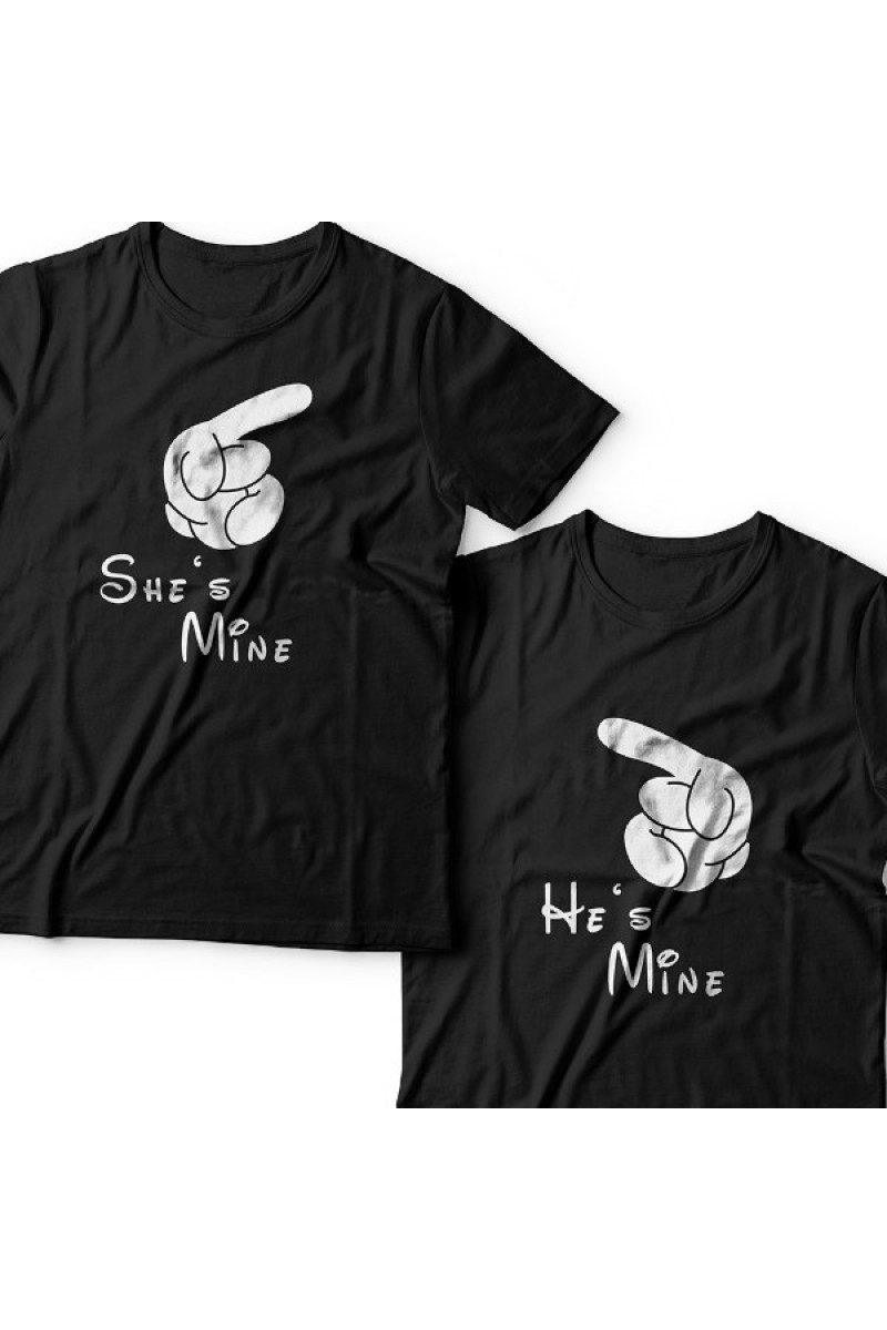 Парные футболки для влюбленных с указывающими друг на друга пальцами и подписями "она моя" и "он мой". Надписи и рисунок выполнены в Диснеевской стилистике.
