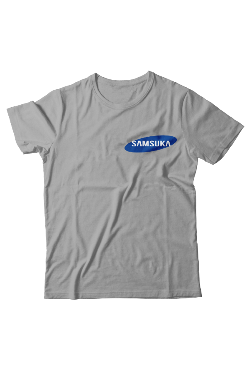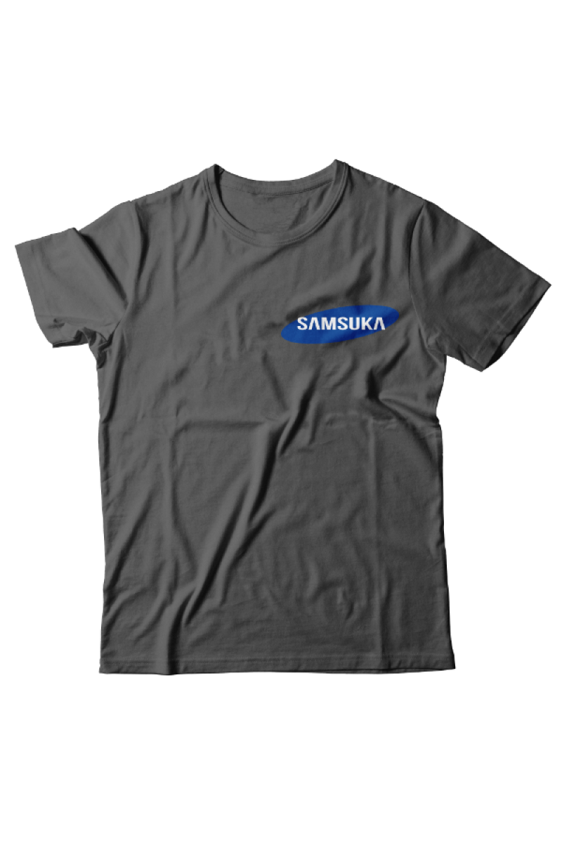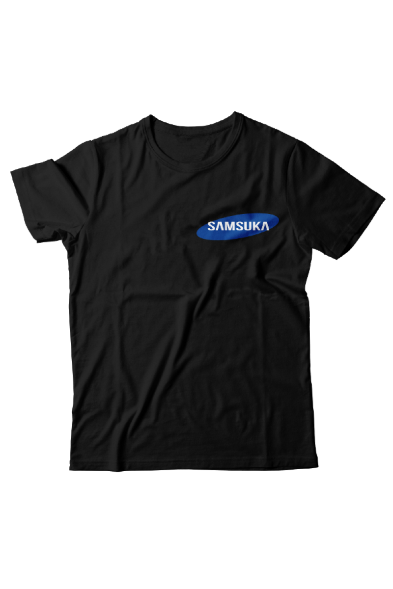 Прикольная футболка с маленьким принтом "Samsuka" - отсылка к логотипу фирмы Samsung.