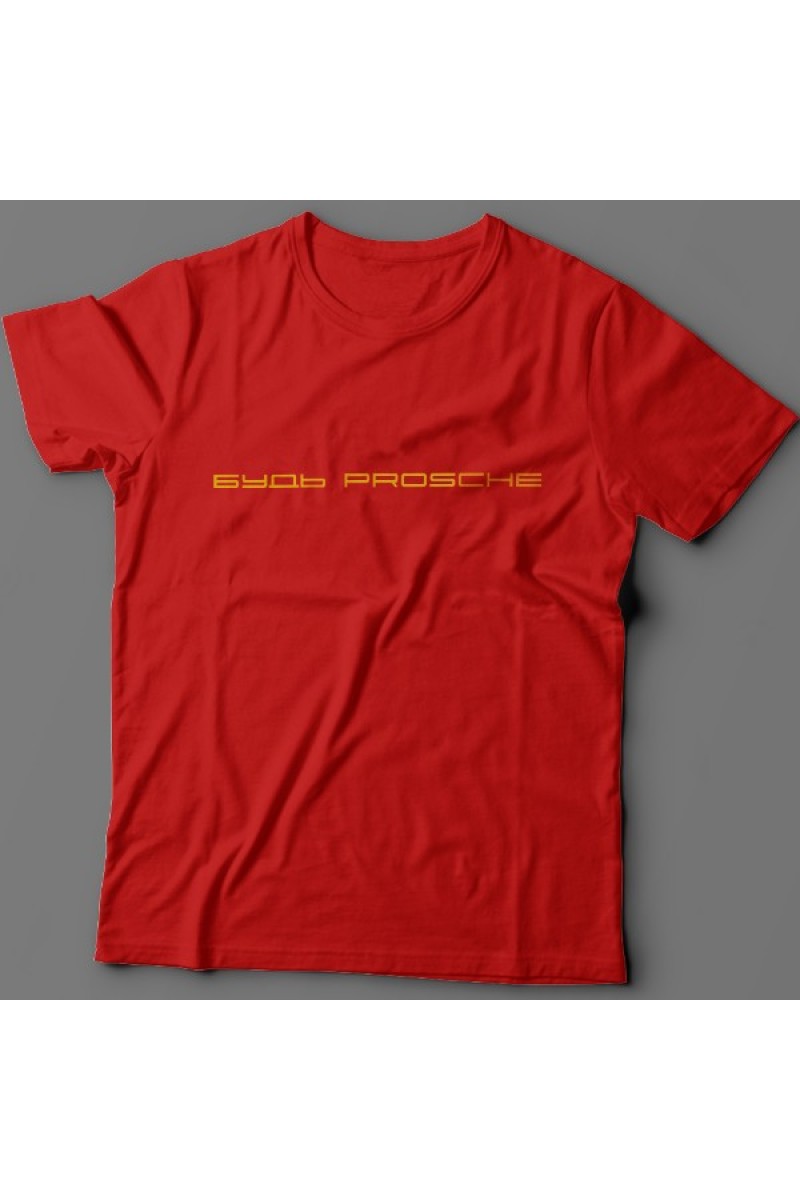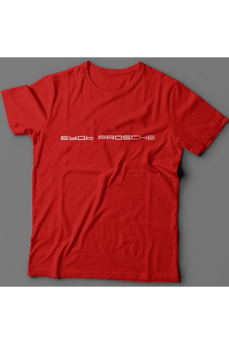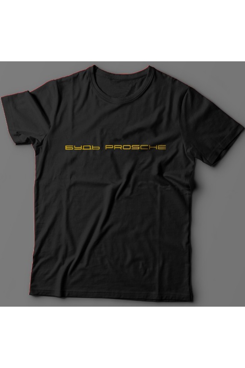 Прикольная футболка с надписью "Будь prosche". Надпись выполнена шрифтом porsche.