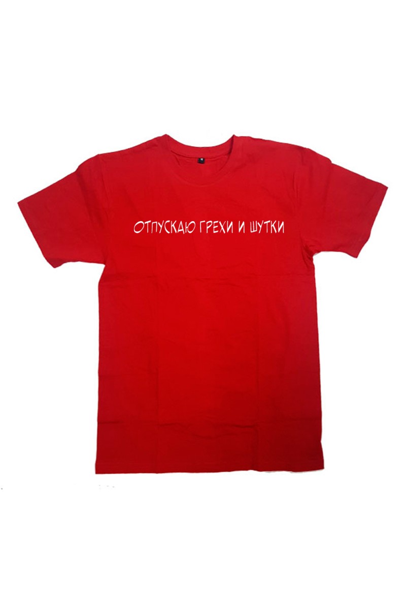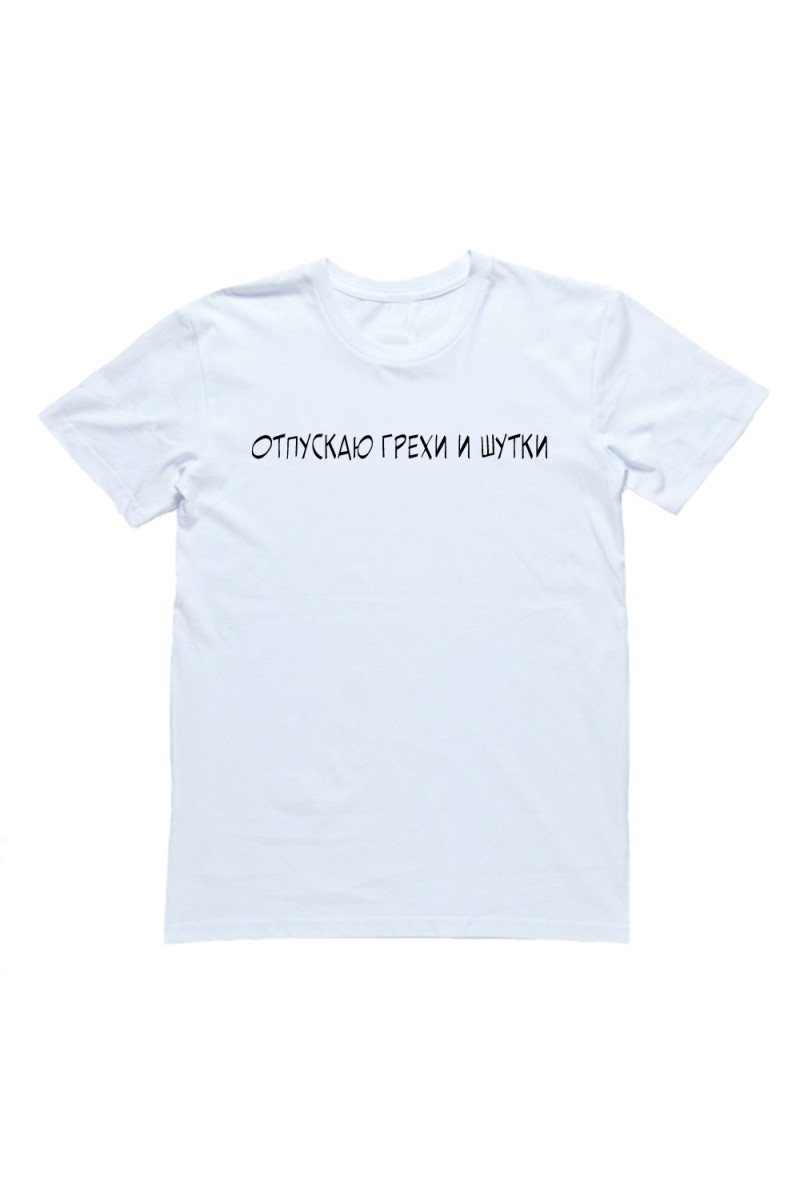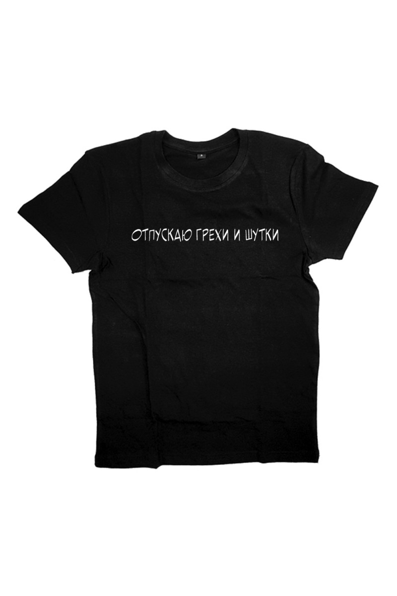 Прикольная футболка с надписью "Отпускаю грехи и шутки"