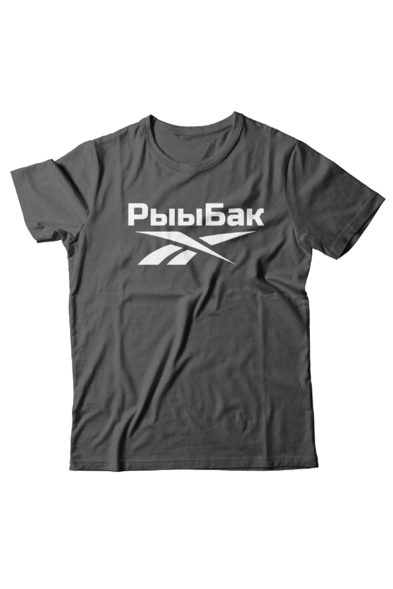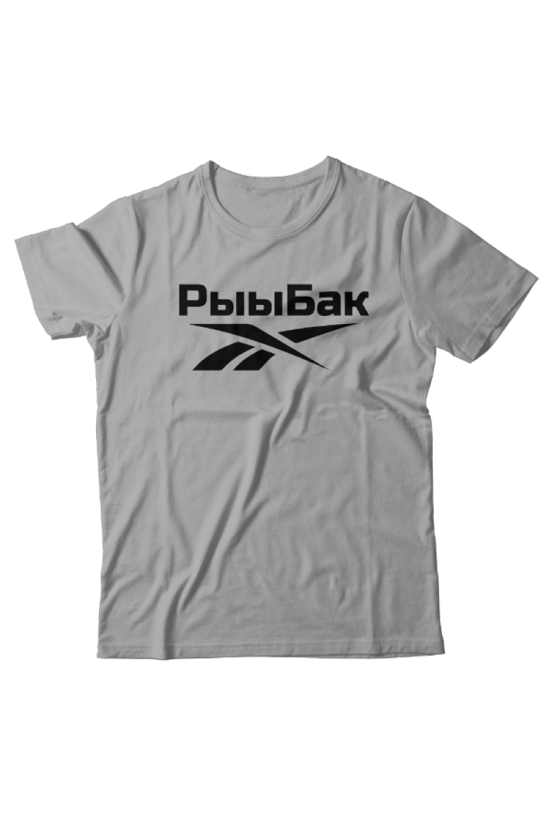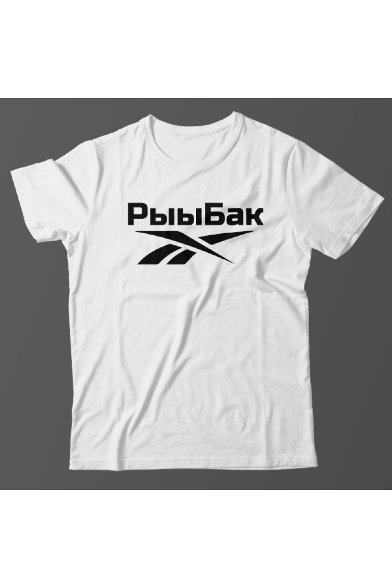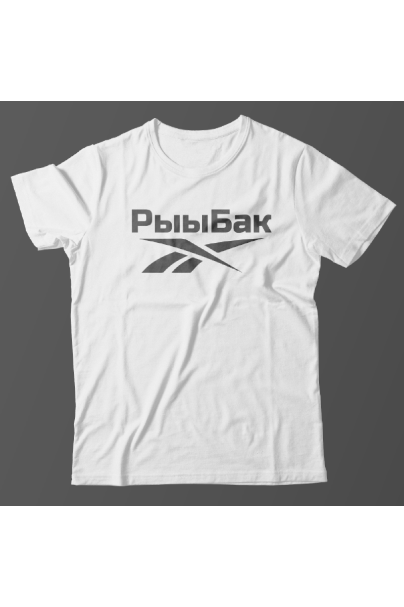 Прикольная футболка с принтом "Рыыбак" - отсылка к логотипу фирмы Reebok.