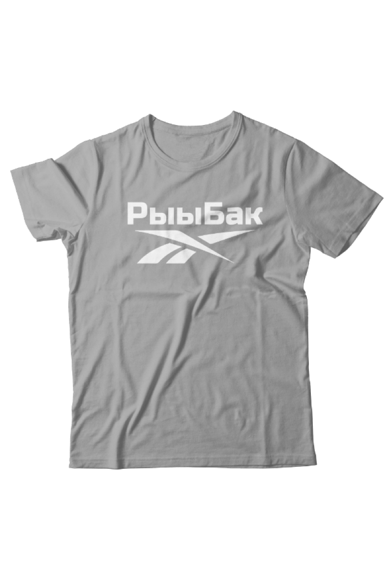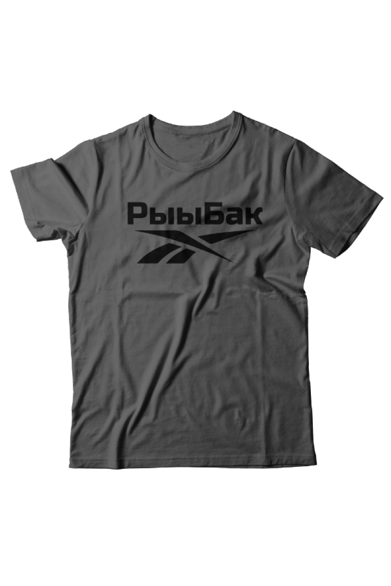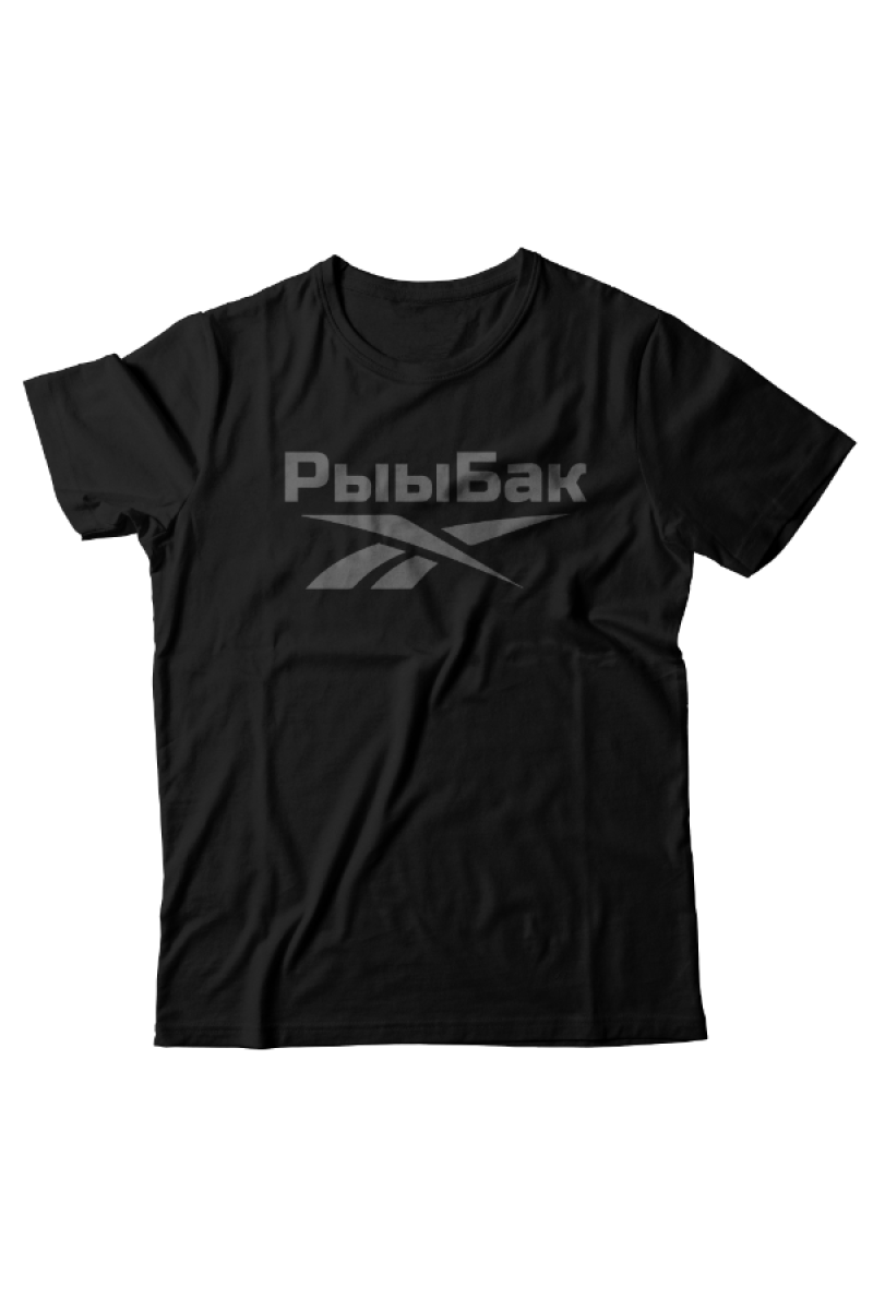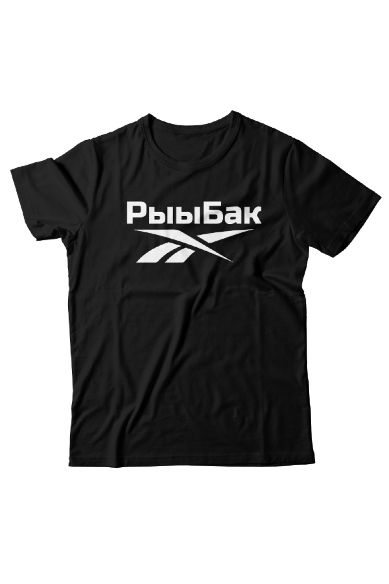 Прикольная футболка с принтом "Рыыбак" - отсылка к логотипу фирмы Reebok.