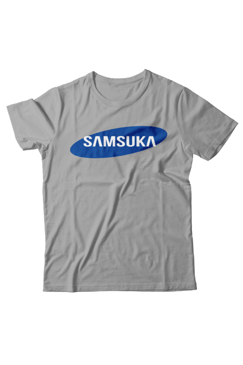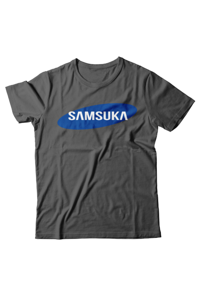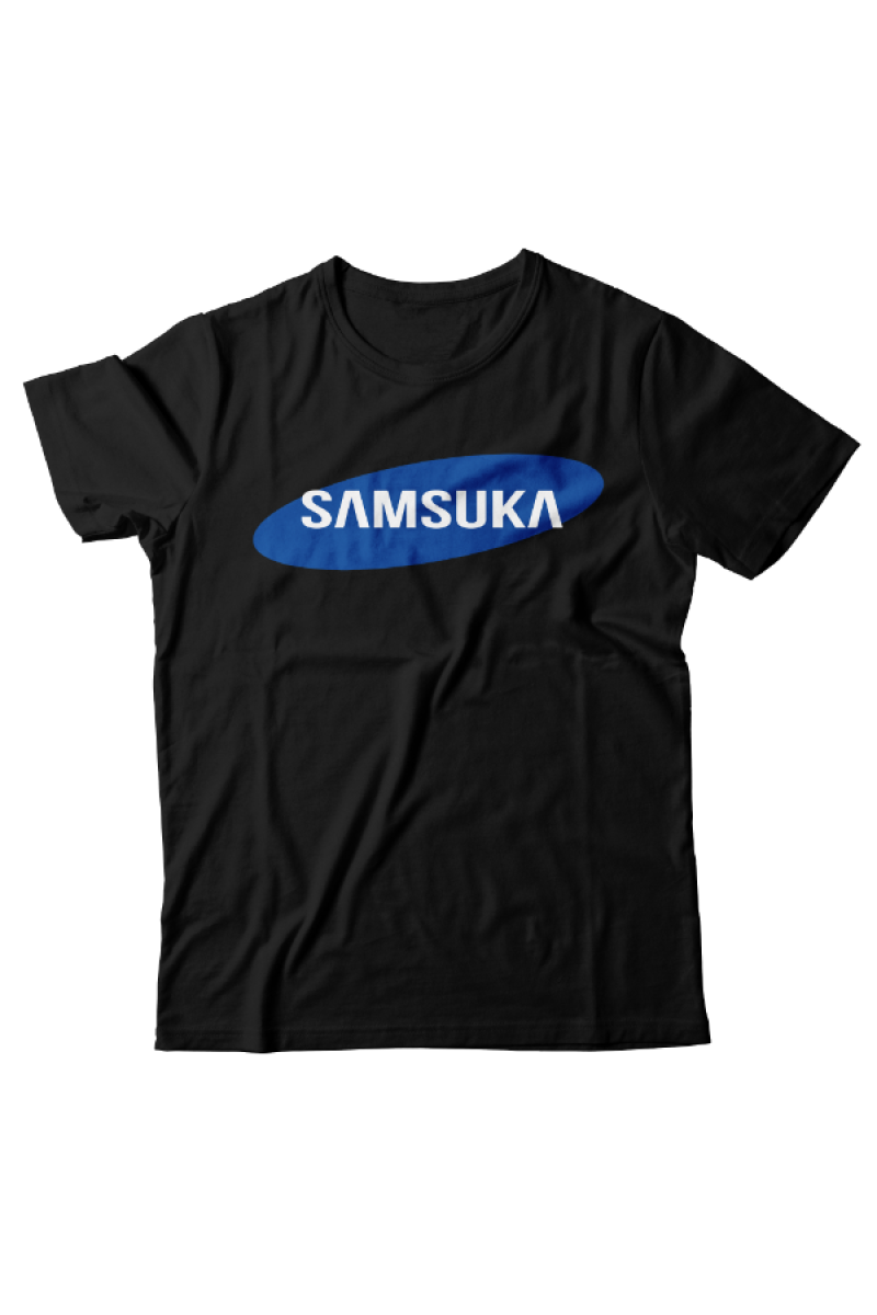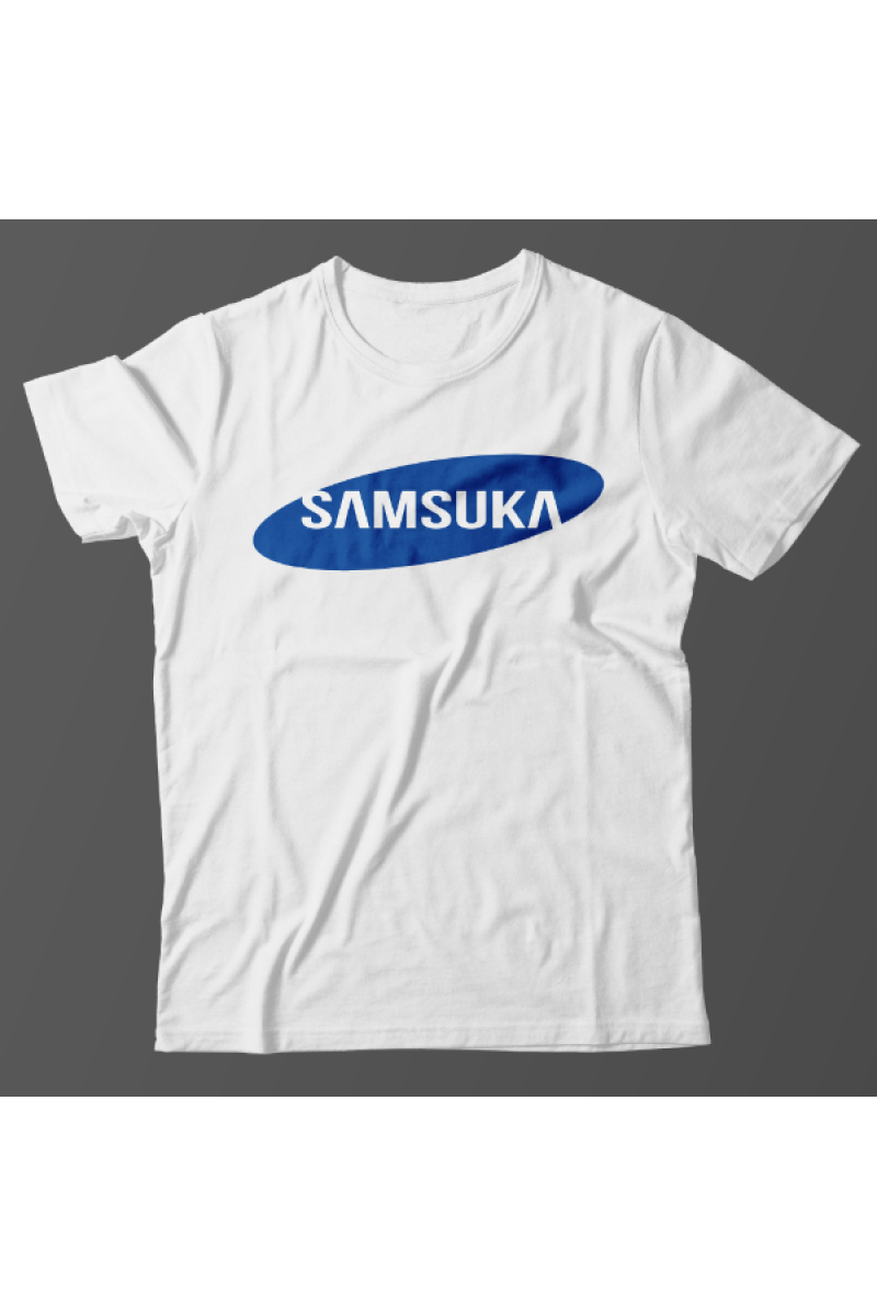 Прикольная футболка с принтом "Samsuka" - отсылка к логотипу фирмы Samsung.