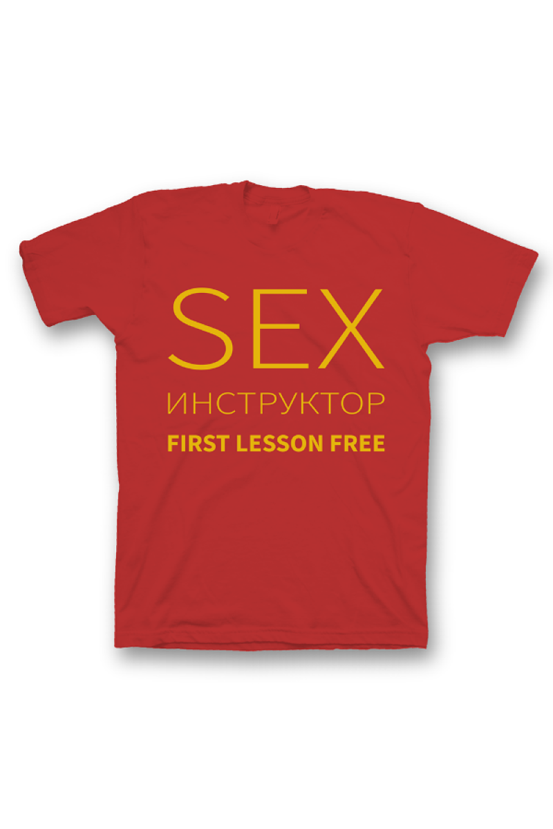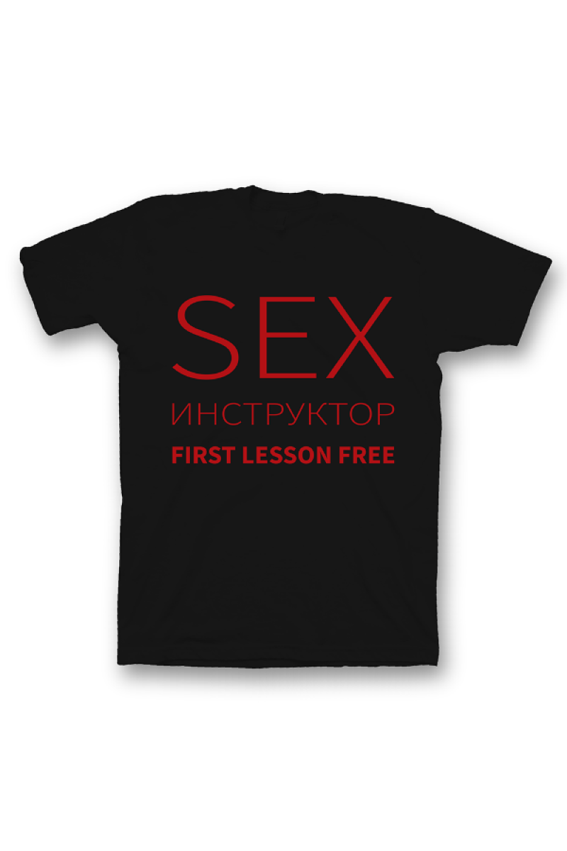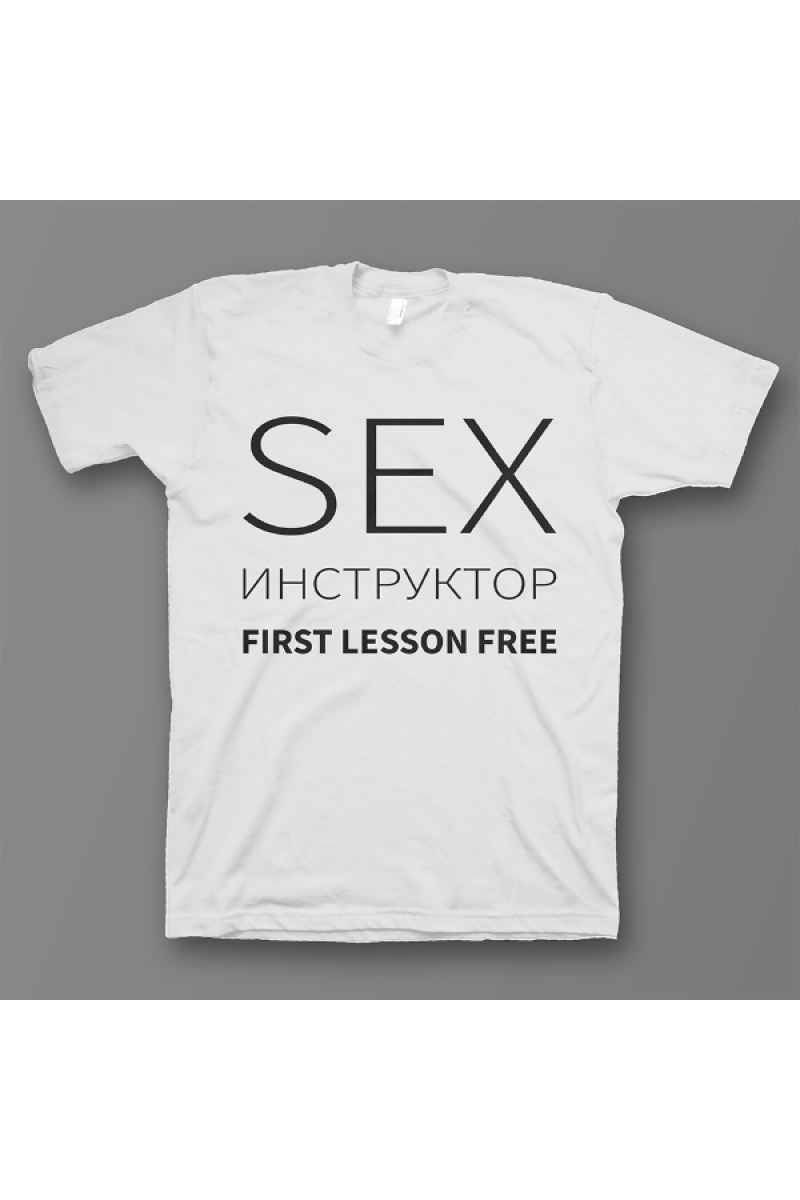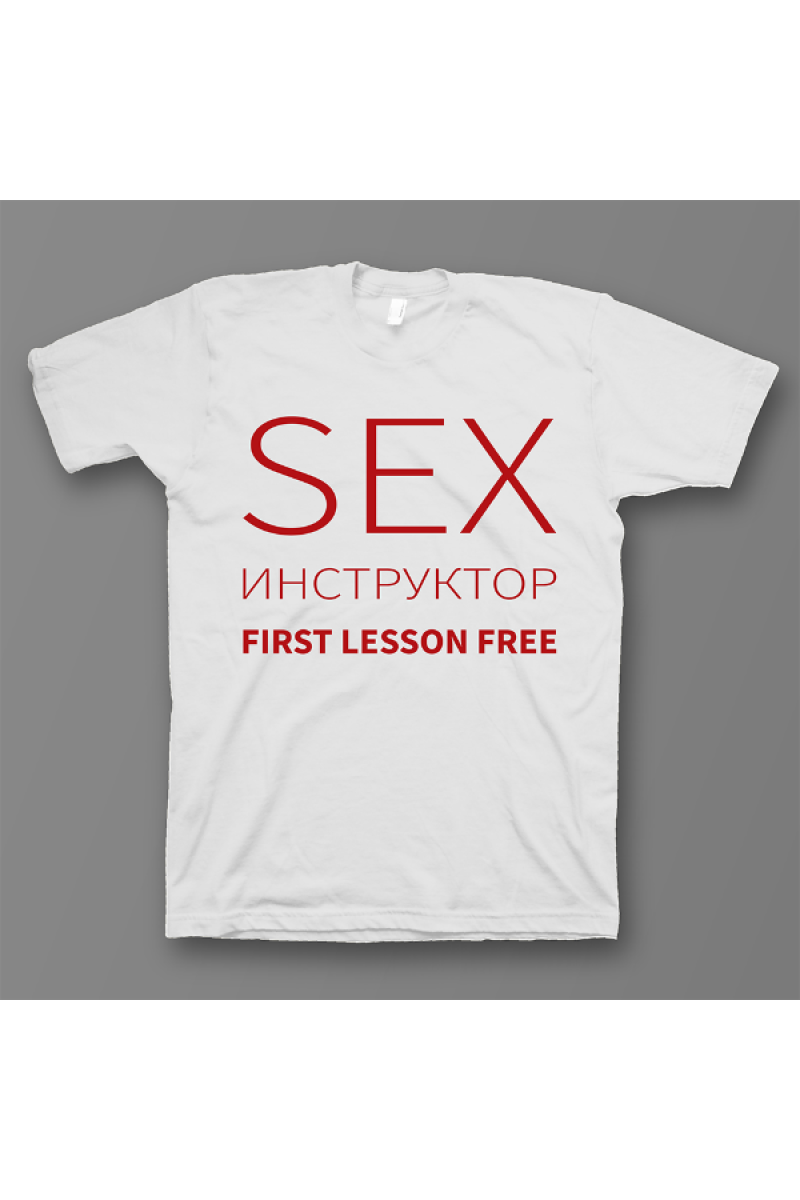 Прикольная футболка с надписью "SEX Инструктор First lesson free" - "Секс инструктор Первый урок бесплатно".
