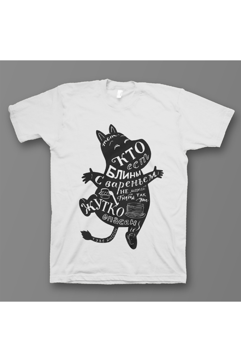 Прикольная футболка с надписью "Тот кто ест блины с вареньем не может быть так уж жутко опасен" - цитата из книги писательницы Туве Янсон. Надпись выполнена внутри силуэта Мумми троля.