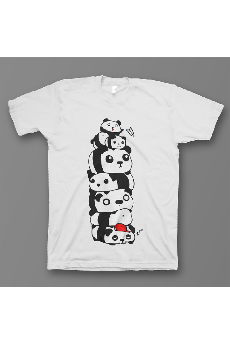 Прикольная футболка со смешным принтом на котором изображены панды лежащие друг на друге в разных костюмчиках.