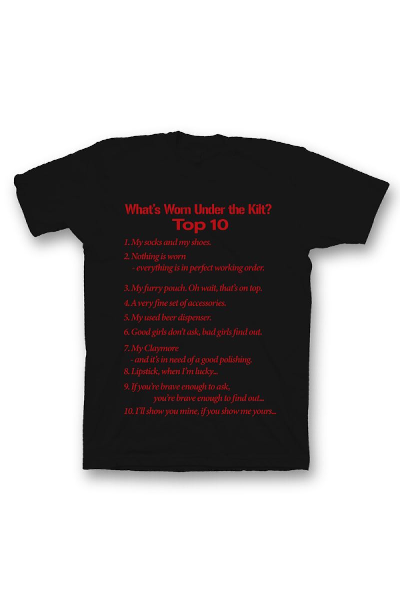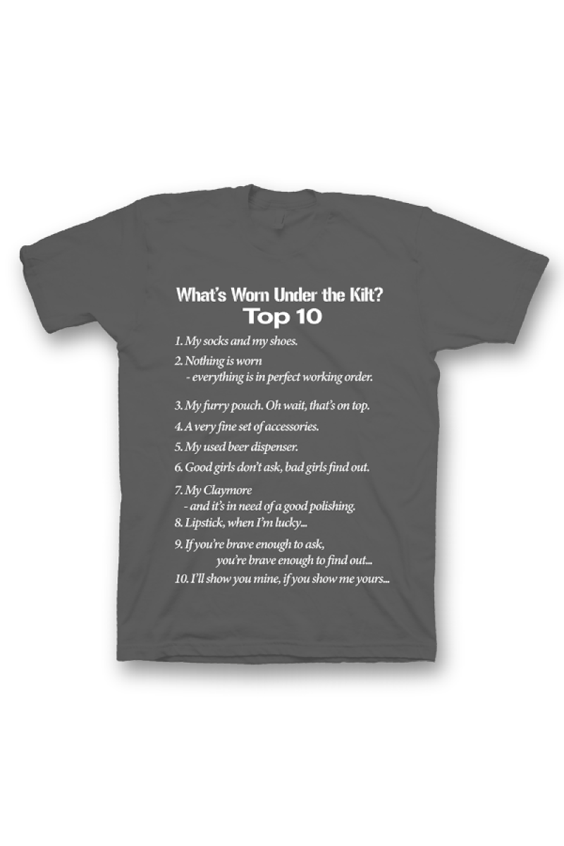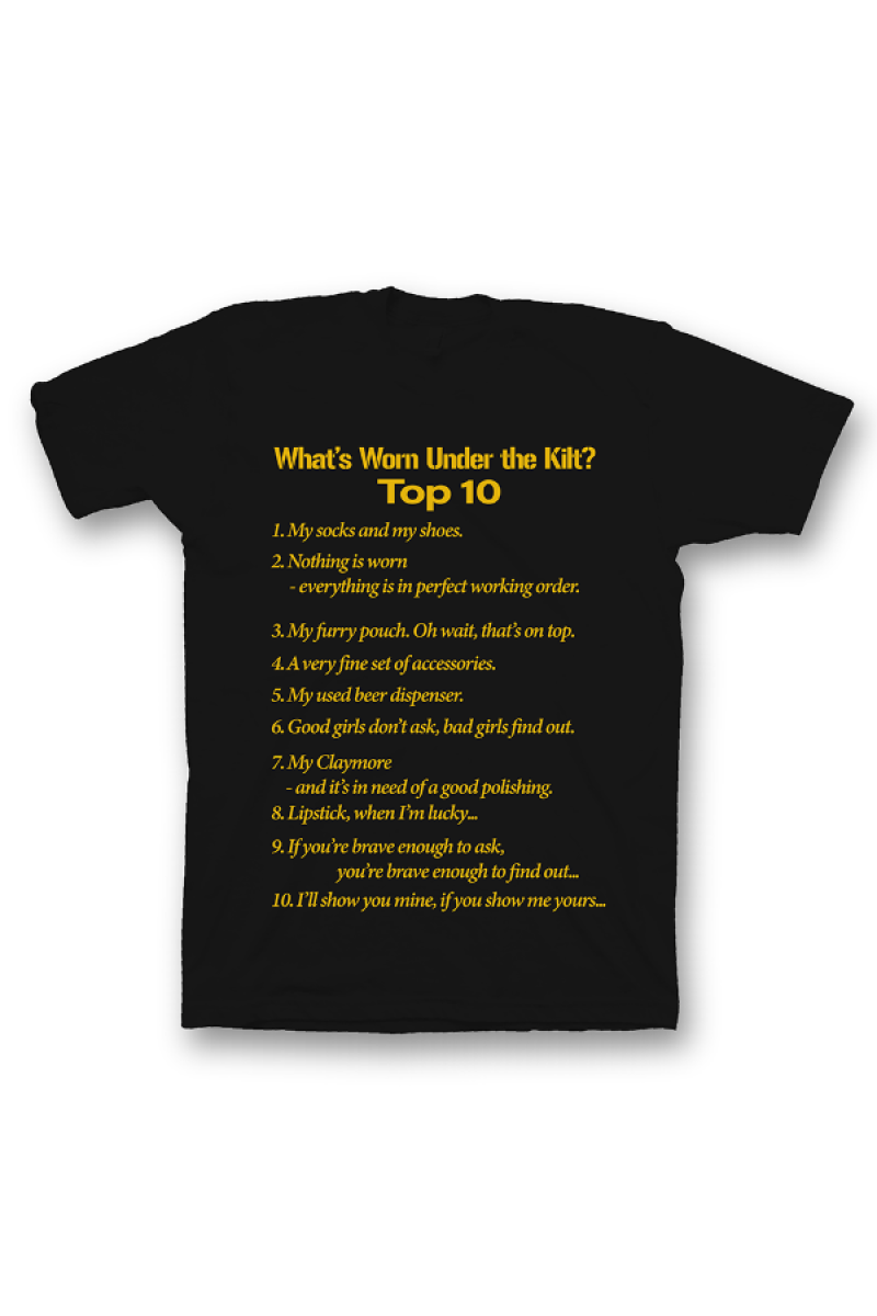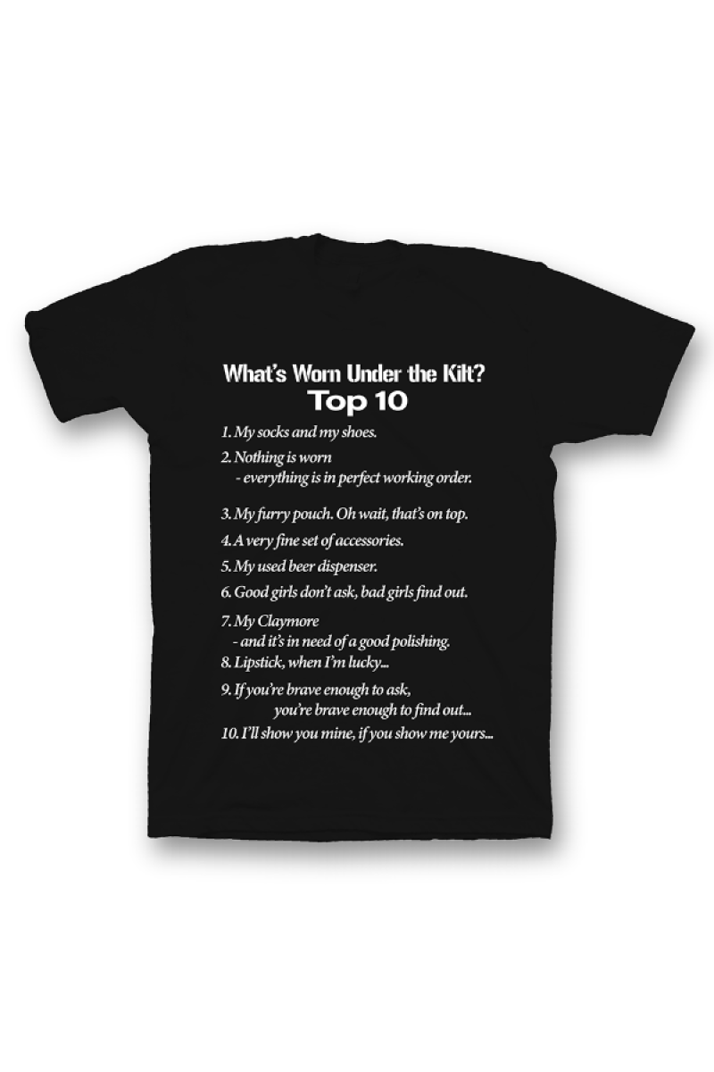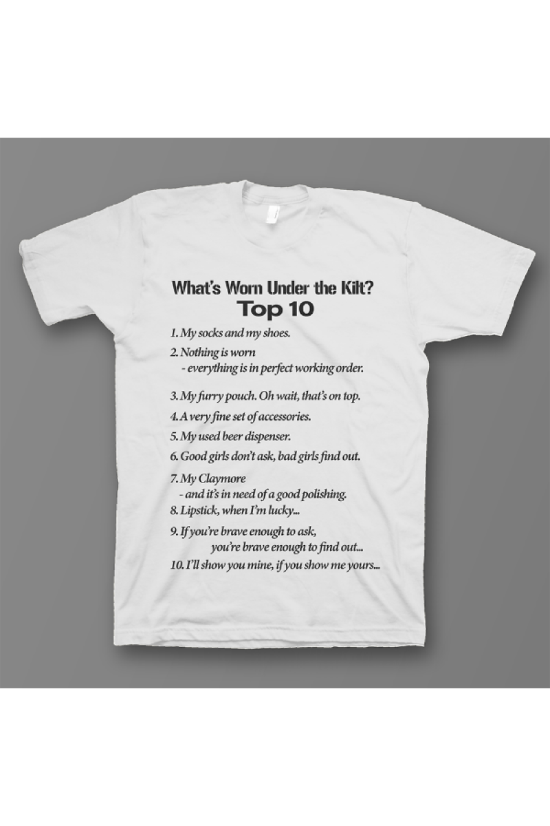 Прикольная футболка с принтом "What's Worn under the Kilt?" - "Что носят под килтом?".