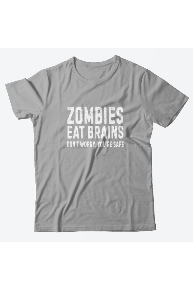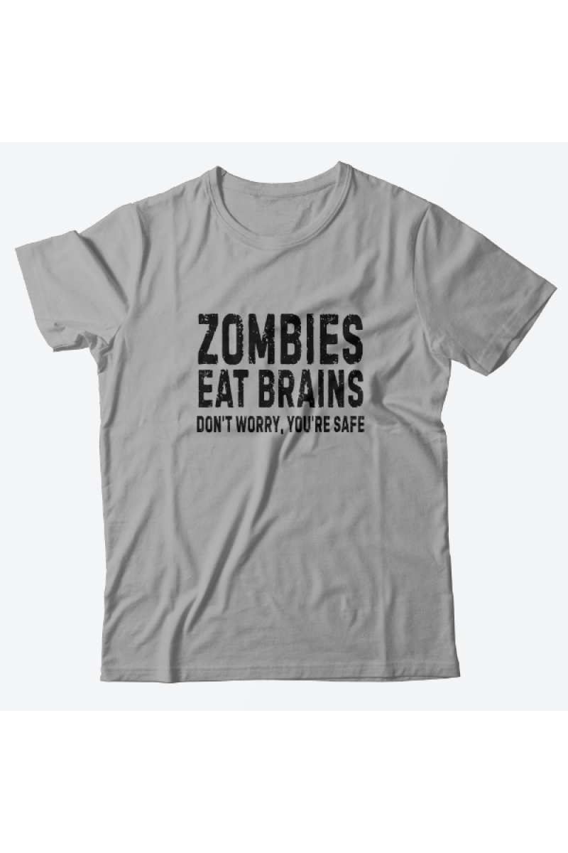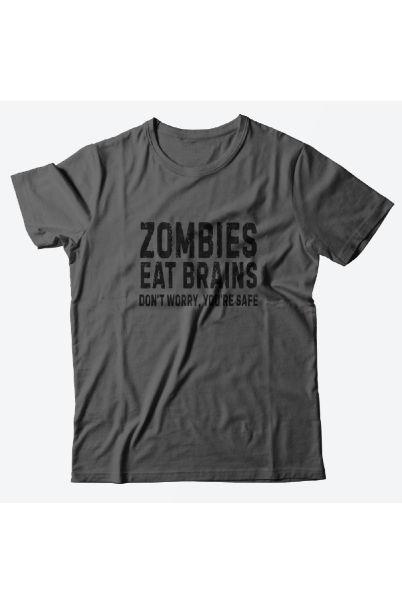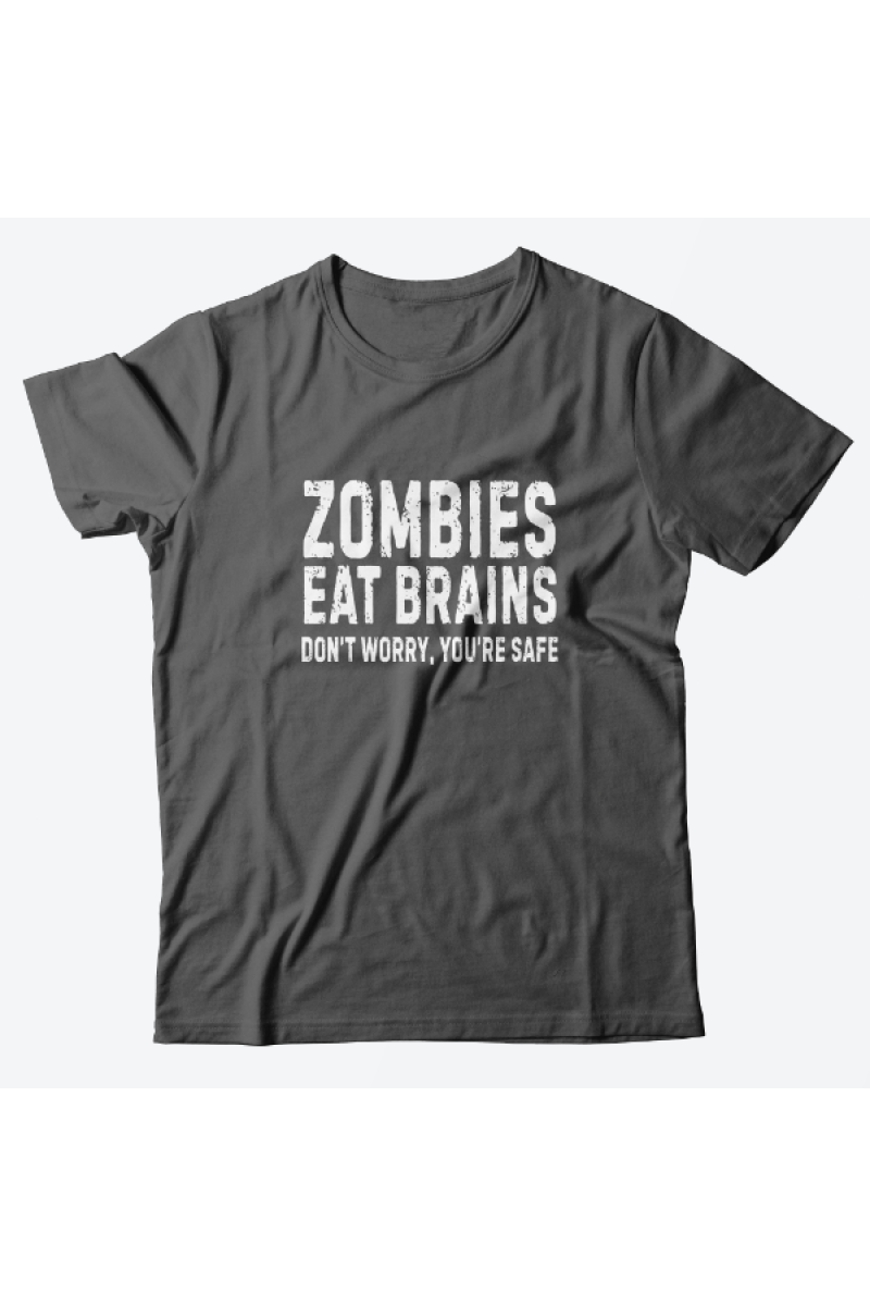 Прикольная футболка с принтом "Zombies eat brains Don't worry you are safe" - "Зомби едят мозги, не переживай, ты в безопасности".