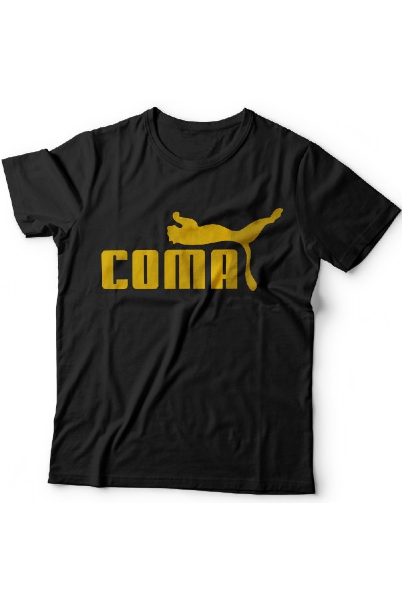 Смешная футболка с надписью "Coma". Надпись выполнена в стилистике шрифта компании PUMA , на надпись "прилегла" пума, как будто у неё кома.