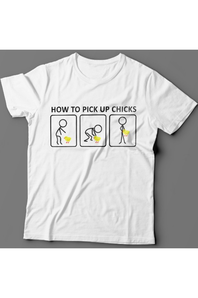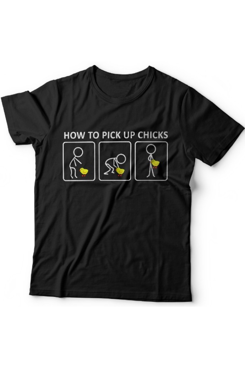 Смешная футболка с надписью "How to pick up chicks" - Как заполучить цыпу. Помимо надписи на принте есть смешной комикс основанный на игре слов.