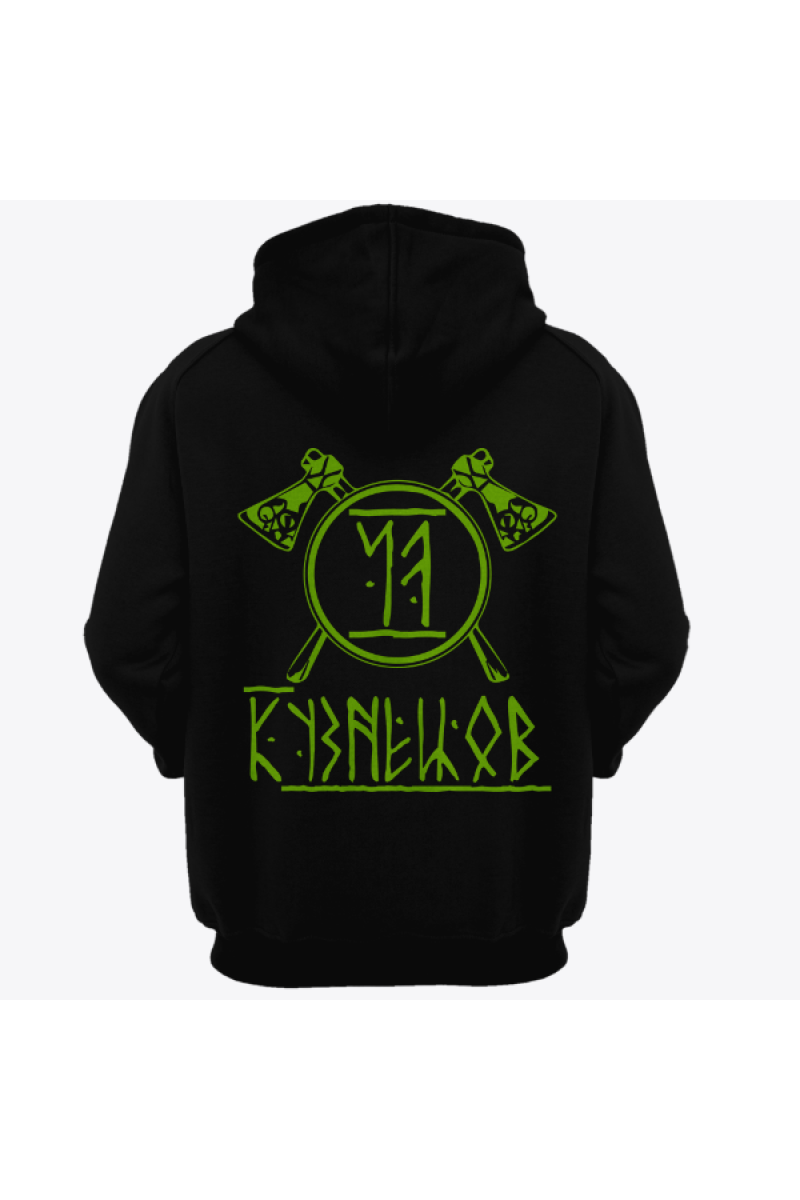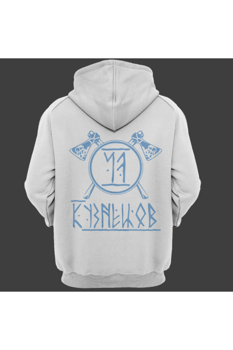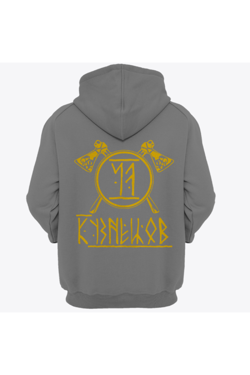 Веселая именная толстовка с руническии шрифтом. Помимо надписи на толстовке есть изображение топоров и щита.
