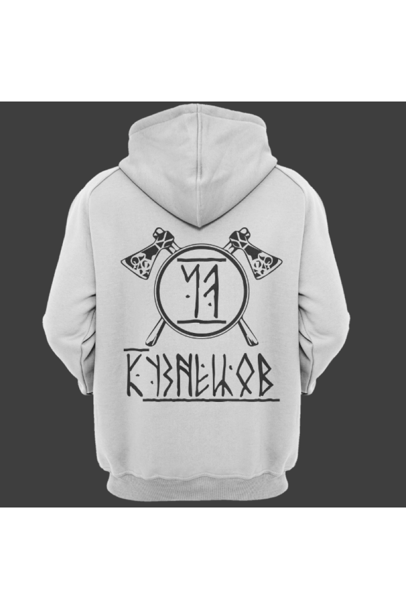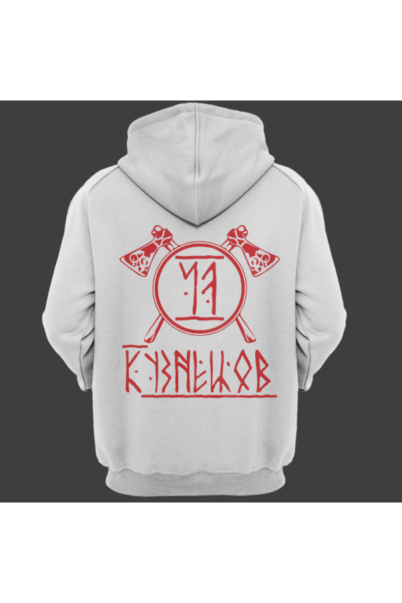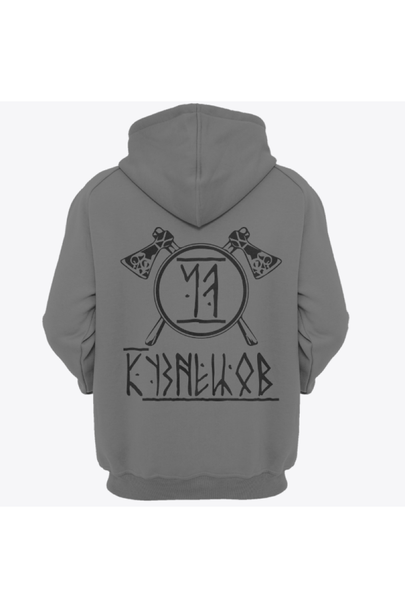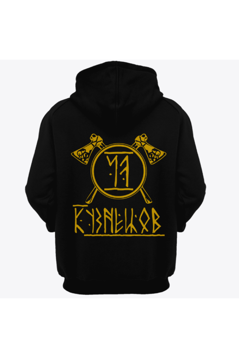 Веселая именная толстовка с руническии шрифтом. Помимо надписи на толстовке есть изображение топоров и щита.
