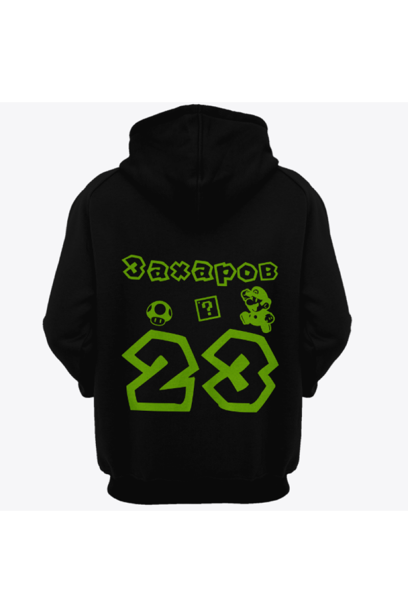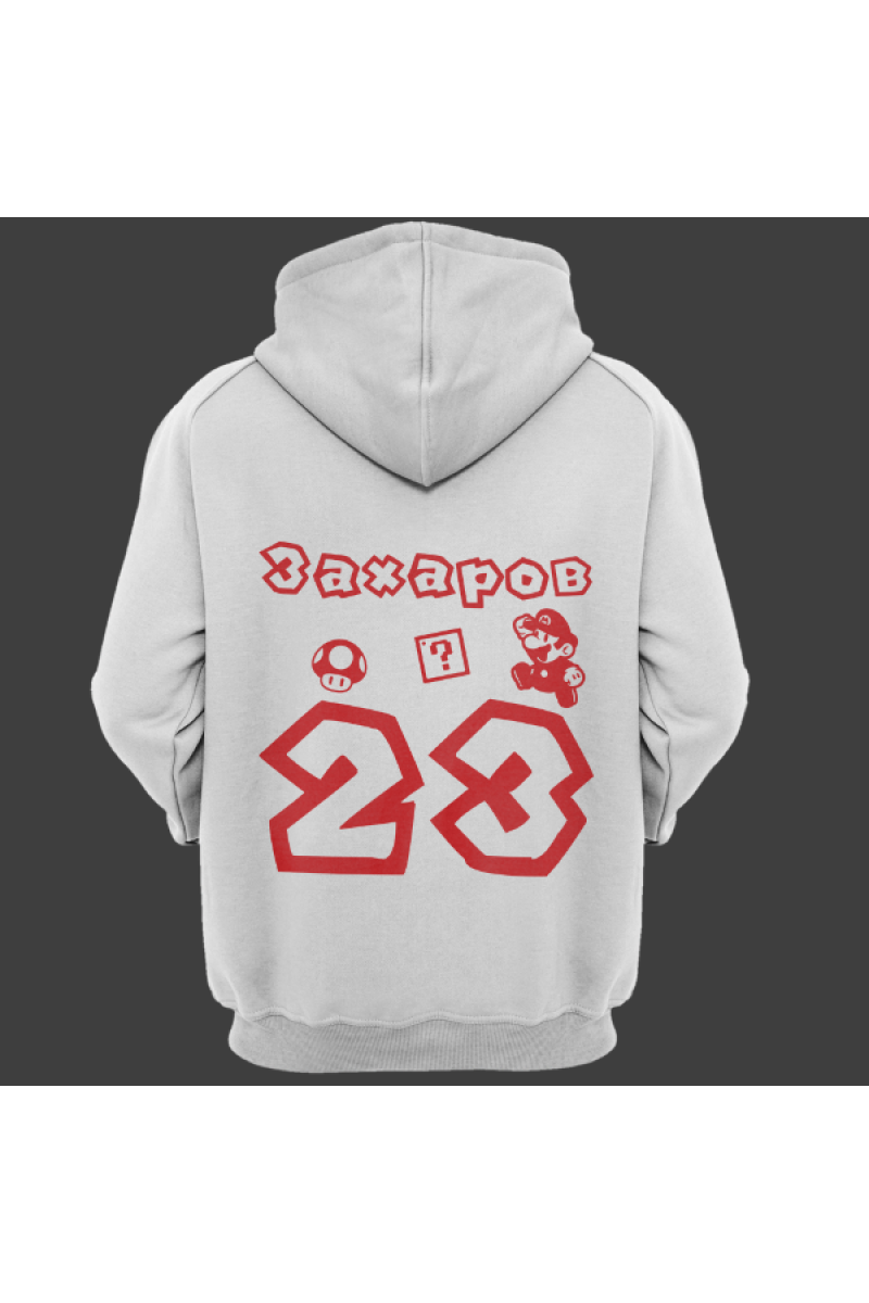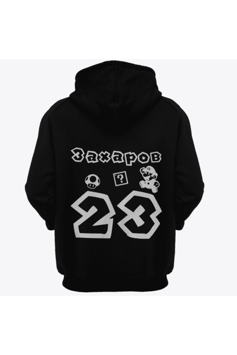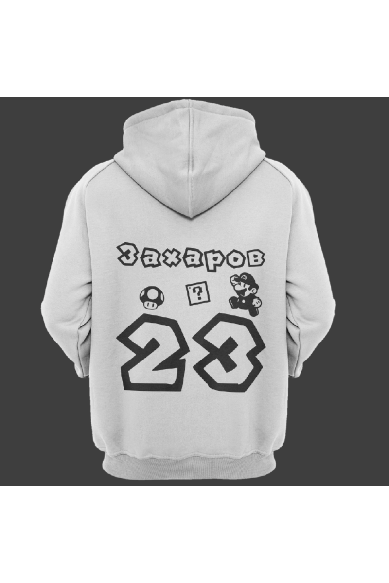 Веселая именная толстовка с шрифтом из игры Super Mario. Помимо надписи на толстовке есть изображение из той же игры.