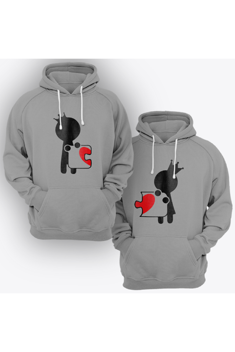 Парные толстовки с капюшоном для влюбленных с принтом на котором изображены человечки соединяющие пазл-сердце.