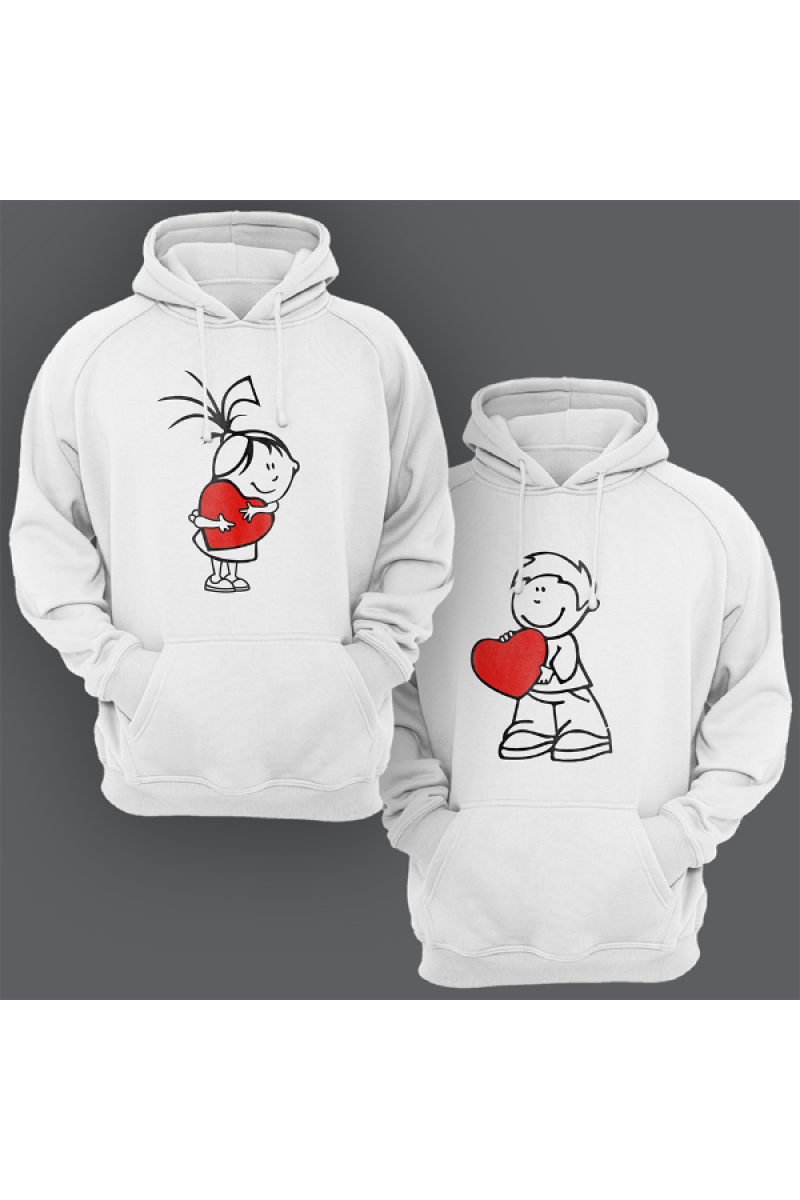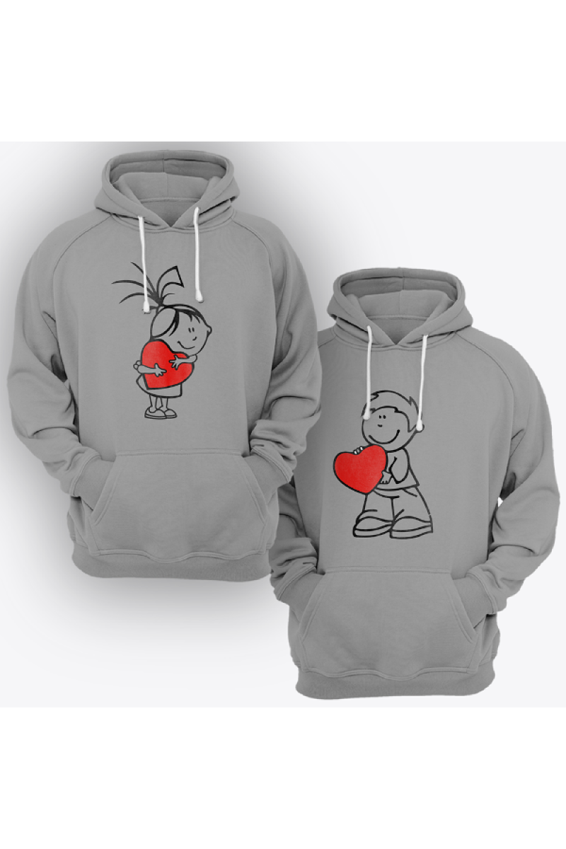 Парные толстовки с капюшоном для влюбленных с рисунком девочки держащей сердце - для нее и мальчика с сердцем - для него.