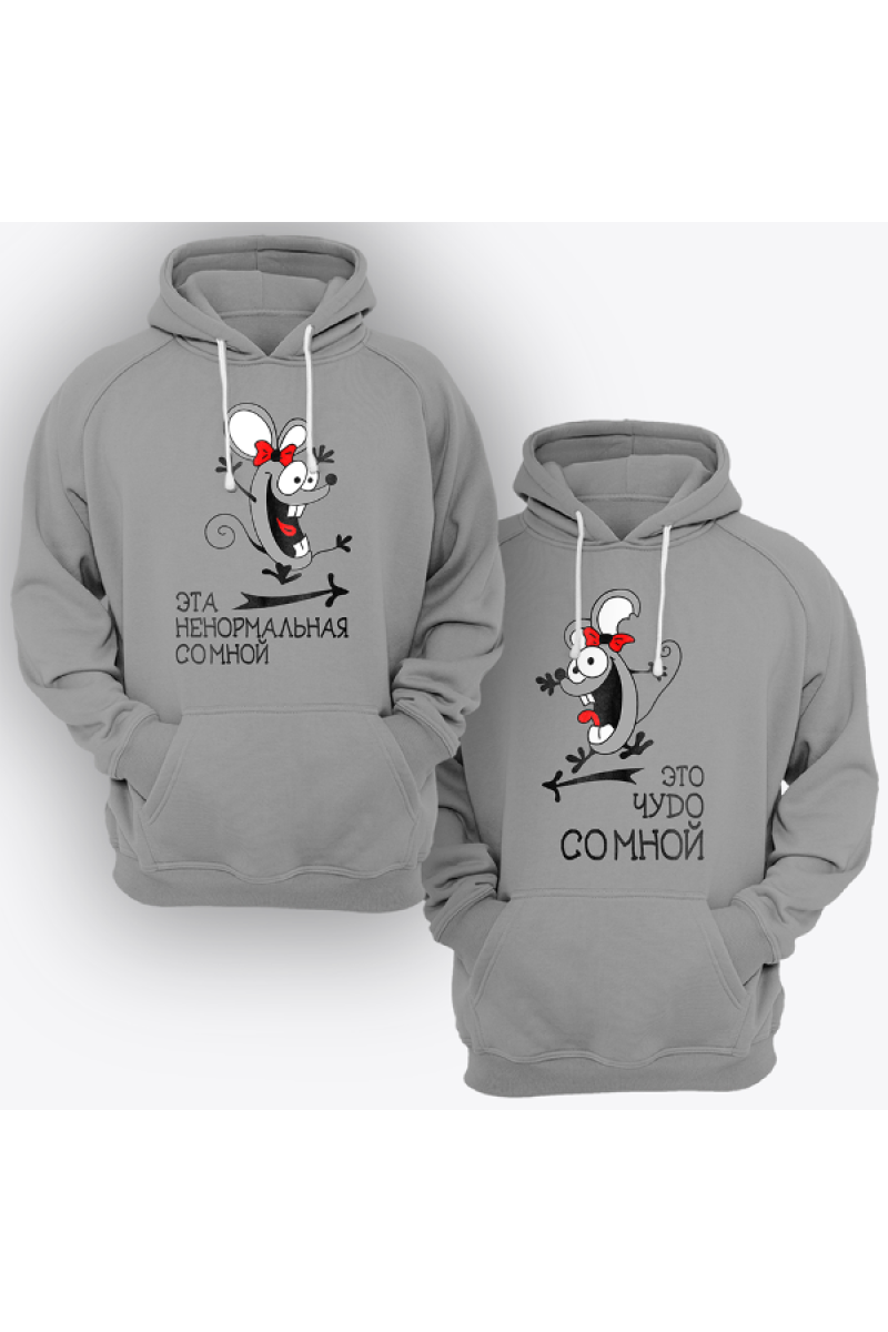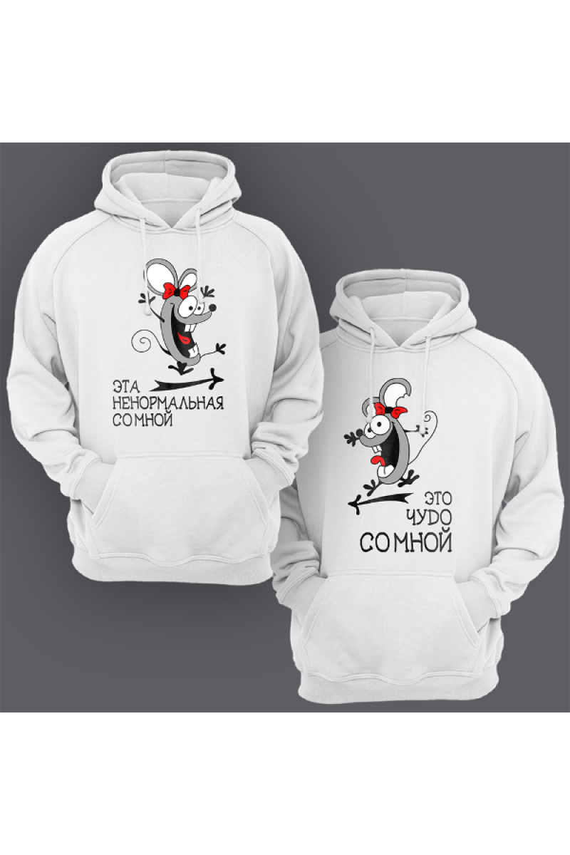Парные толстовки с капюшоном для влюбленных с надписями "Это чудо со мной" - для нее и "Эта ненормальная со мной" - для него. Помимо надписей на принте изображены смешные мышки.