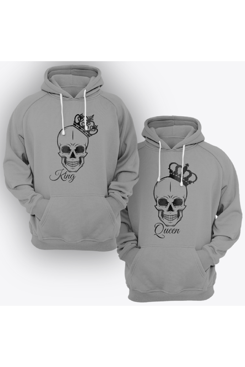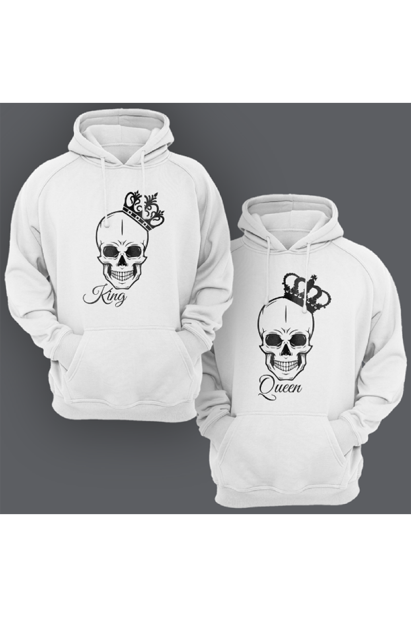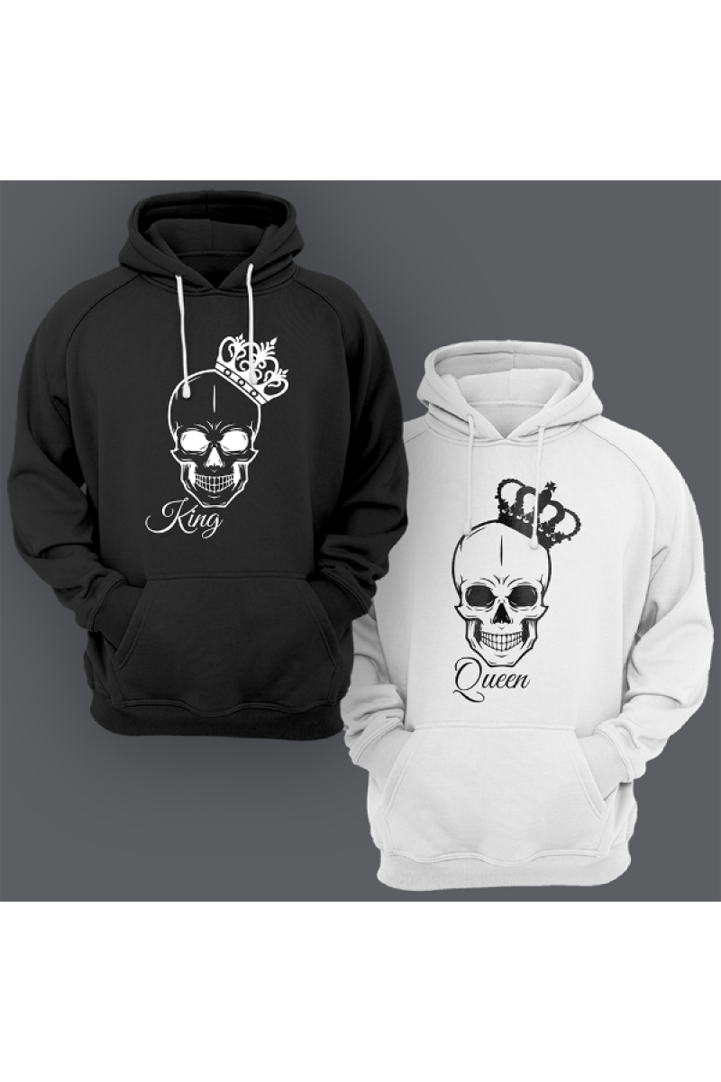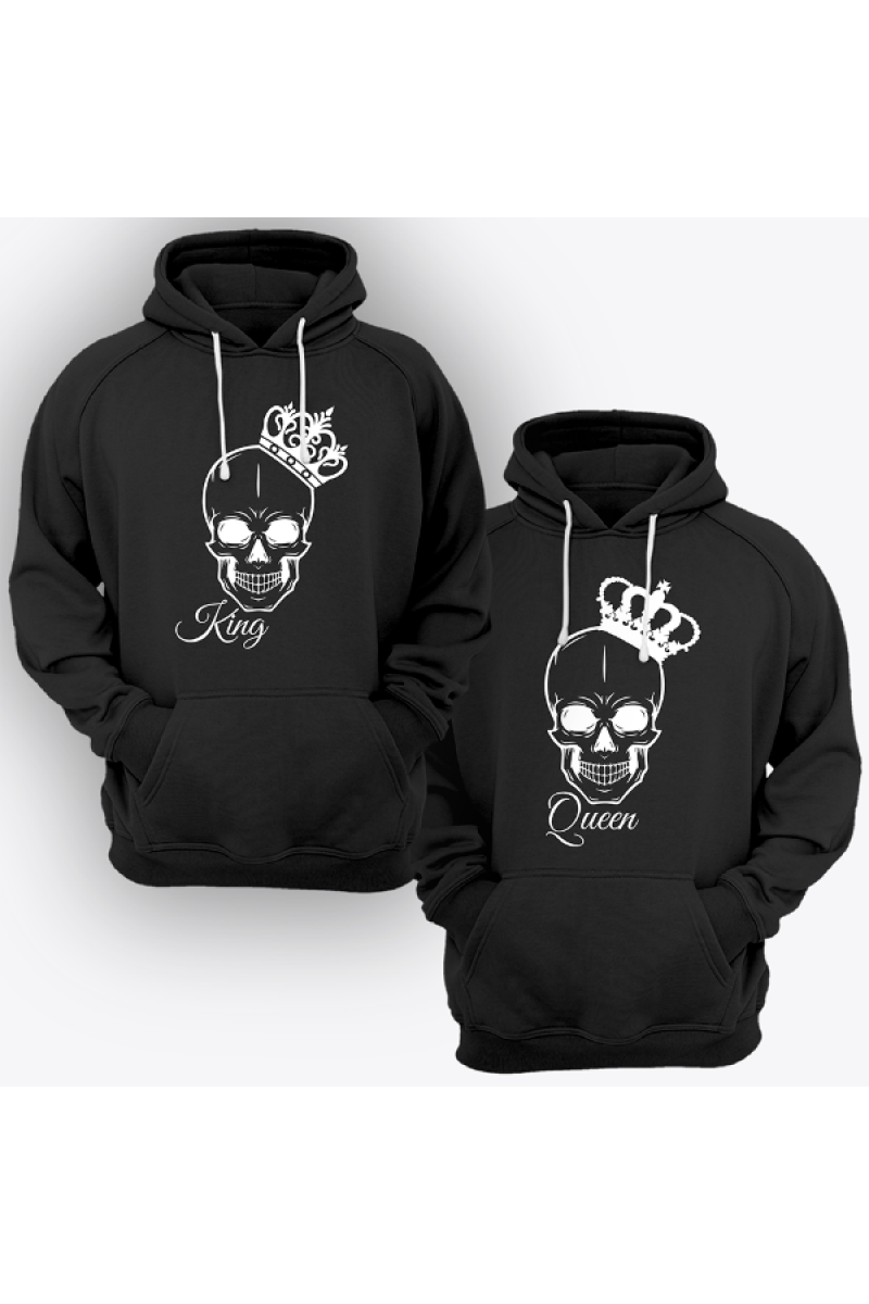 Парные толстовки с капюшоном для влюбленных с надписями "Queen" (Королева) - для нее и "King" (Король) - для него. Помимо надписей на принте изображены черепа с коронами.