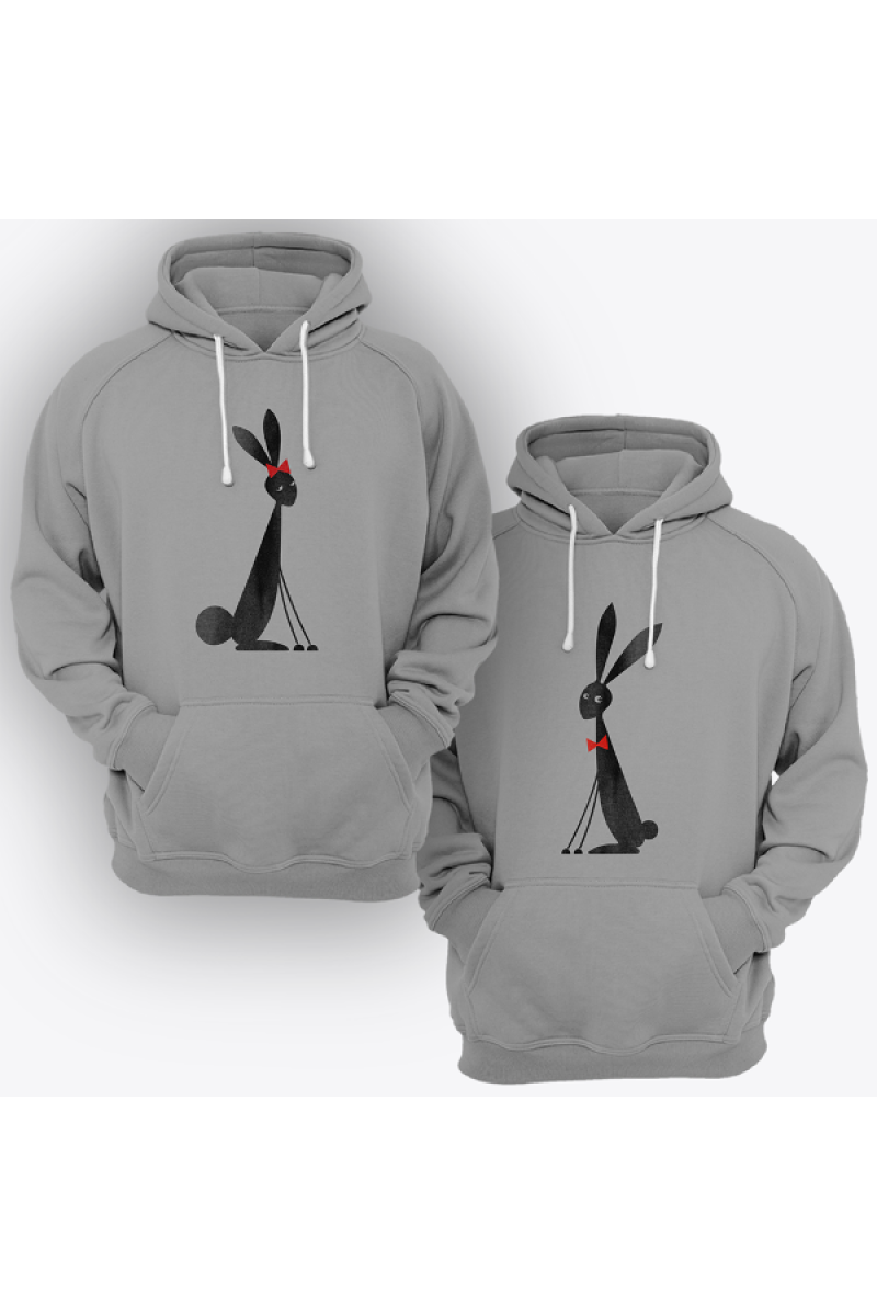 Парные толстовки с капюшоном для влюбленных с принтами на которых изображены забавные кролики.