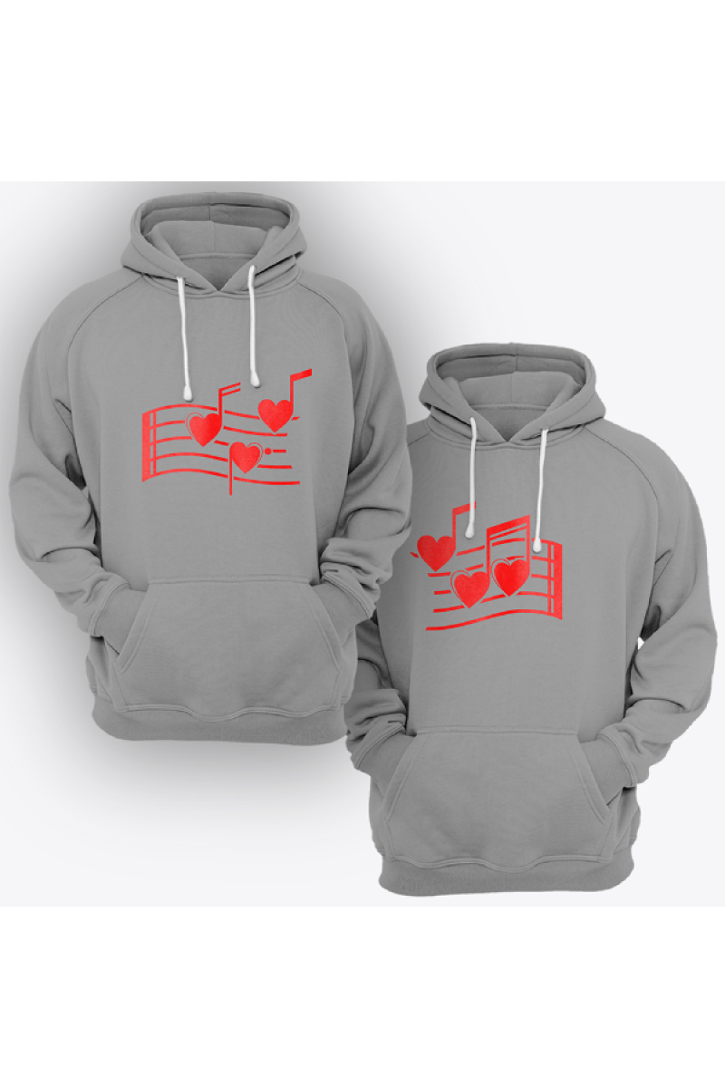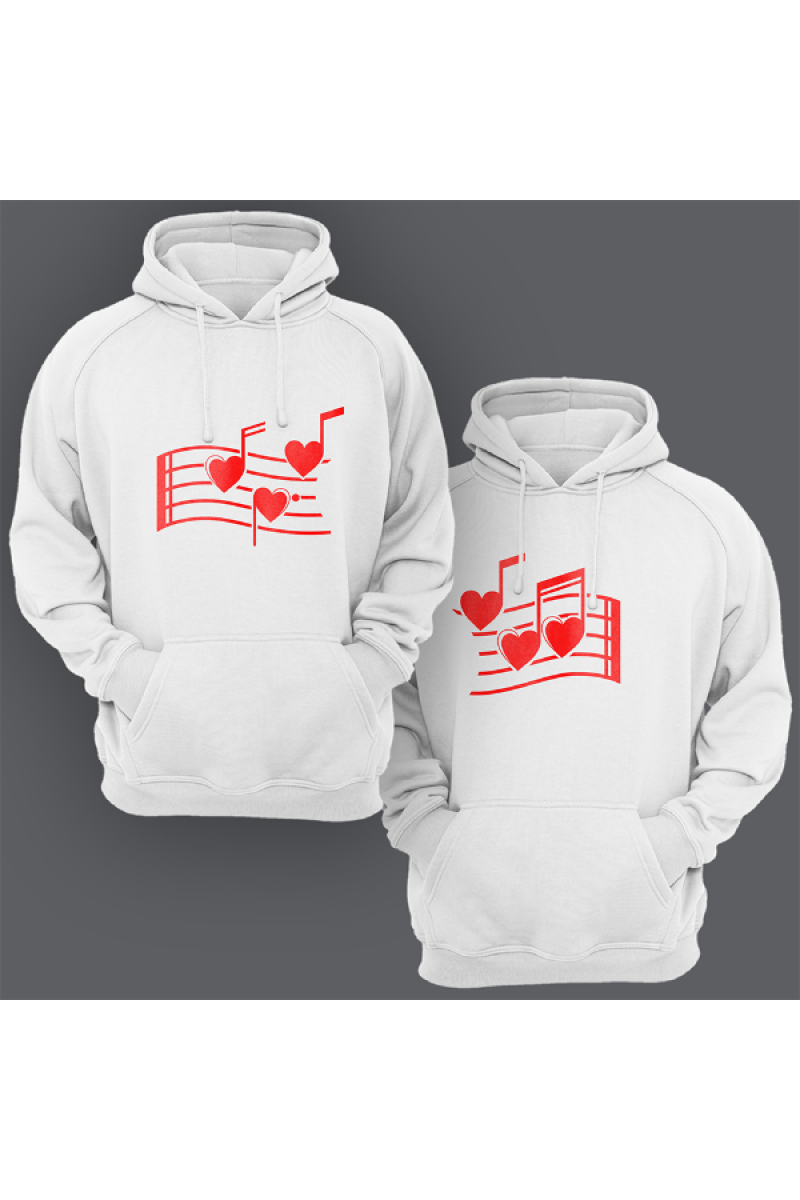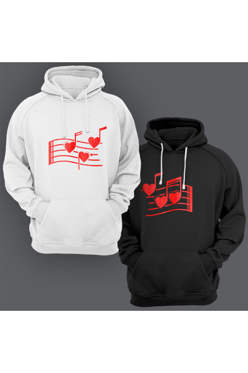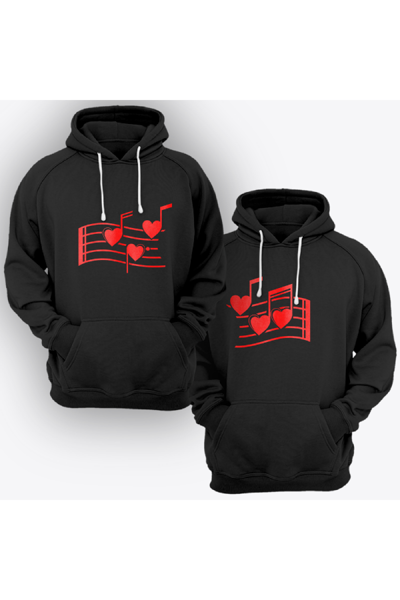 Парные толстовки с капюшоном для влюбленных с принтом на котором изображены нотки в форме сердец.