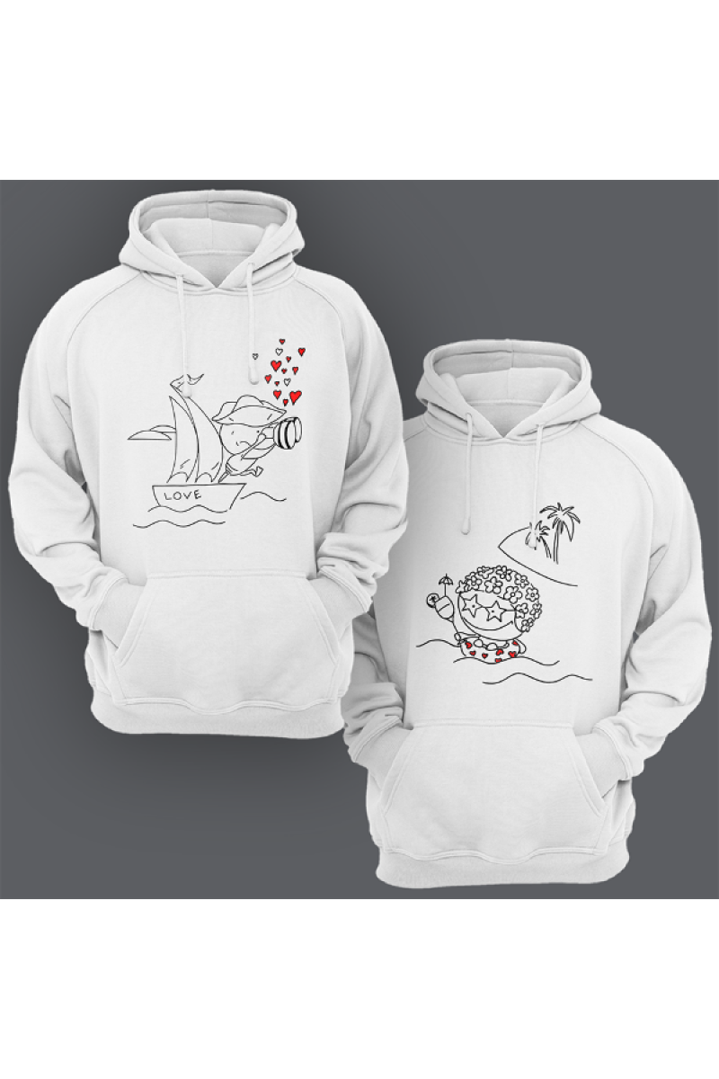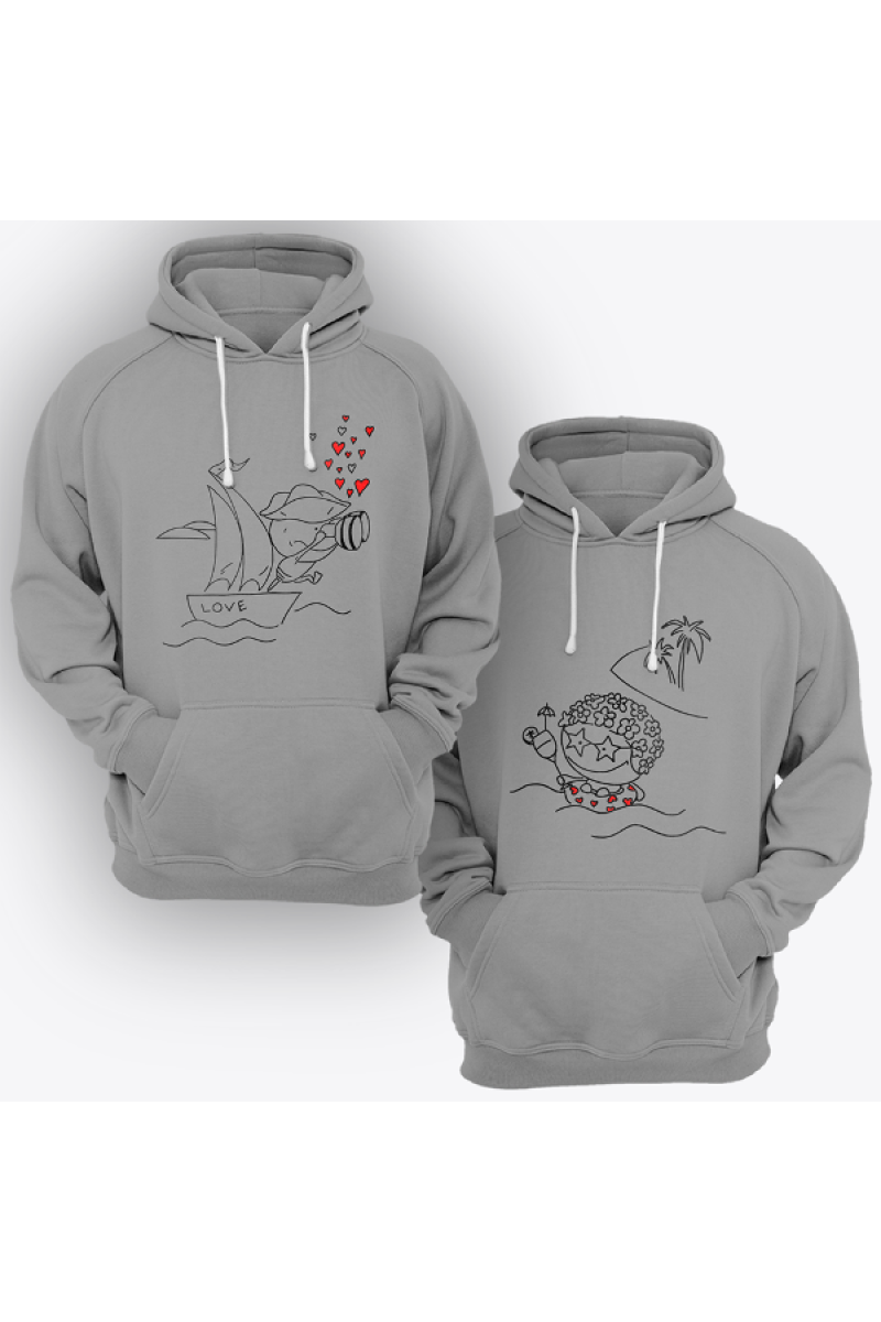Парные толстовки с капюшоном для влюбленных с принтом на котором изображен пират подглядывающий за отдыхающей туристкой.