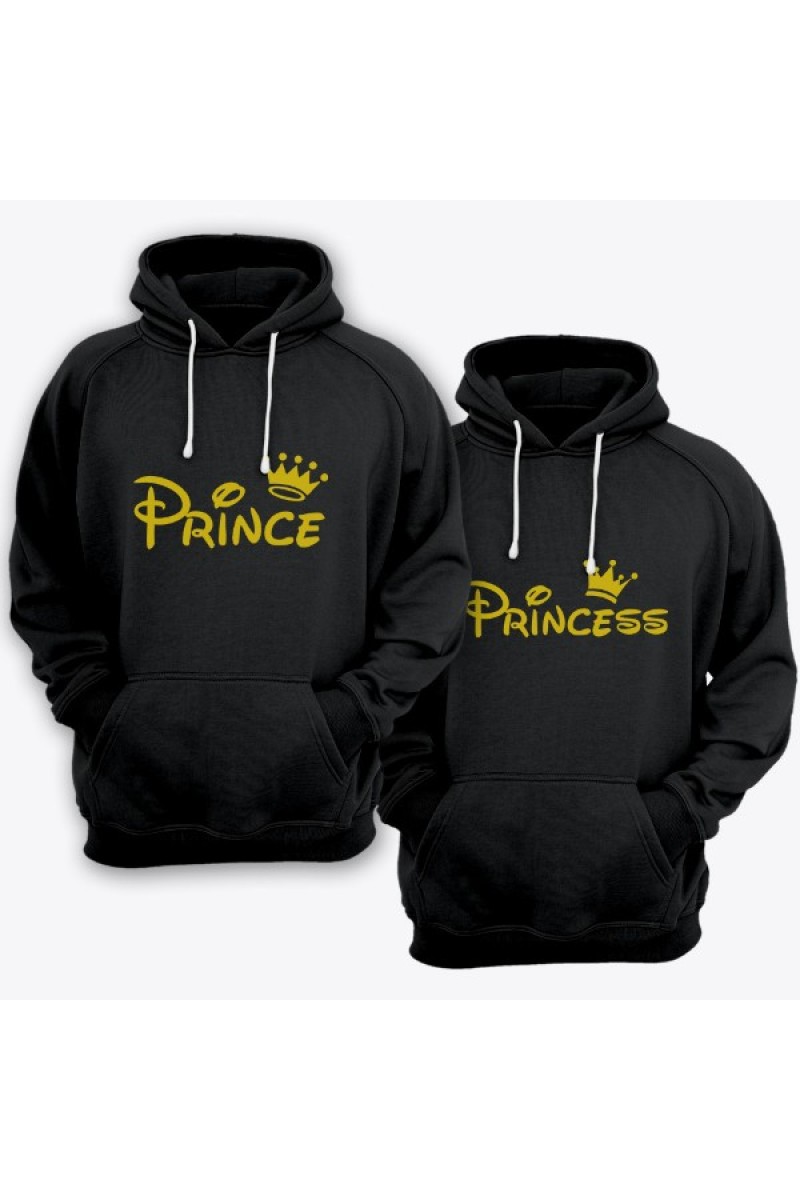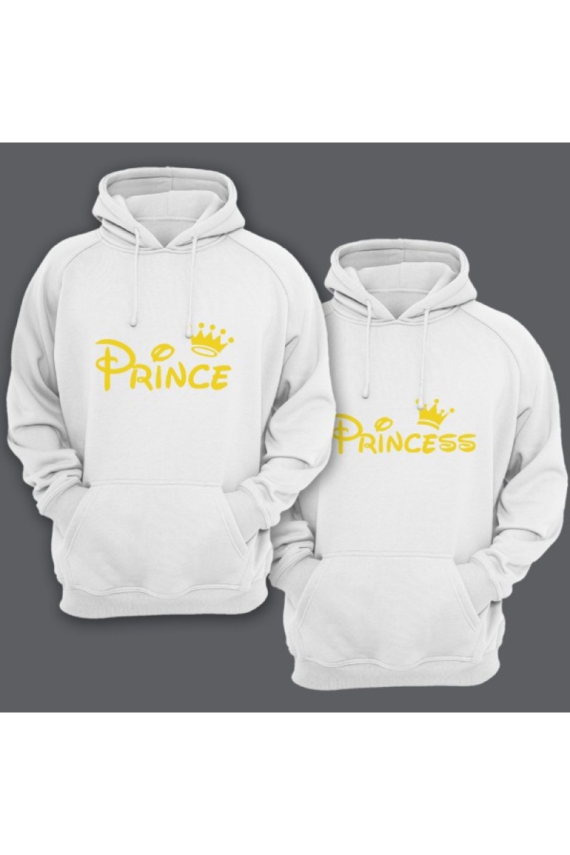 Парные толстовки с капюшоном для влюбленных с надписями "Prince (Принц)" для него и "Princess (Принцесса)" для неё. Надписи и рисунок выполнены в Диснеевской стилистике.