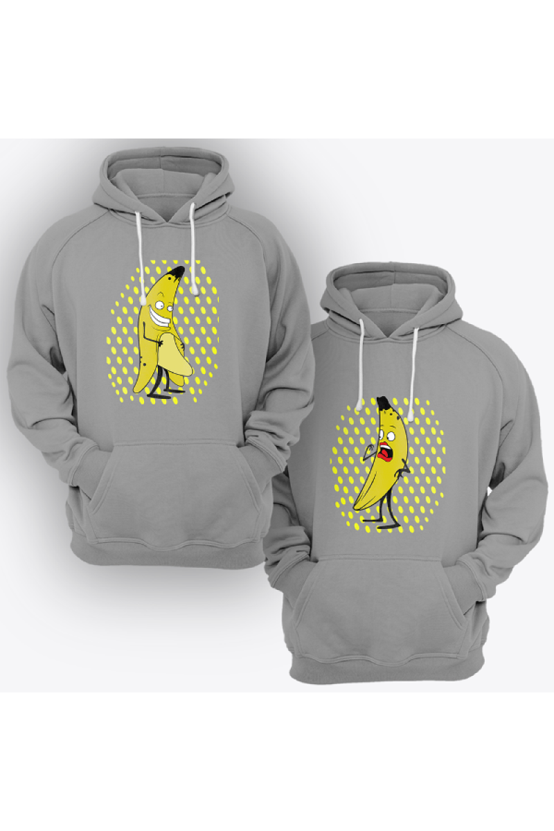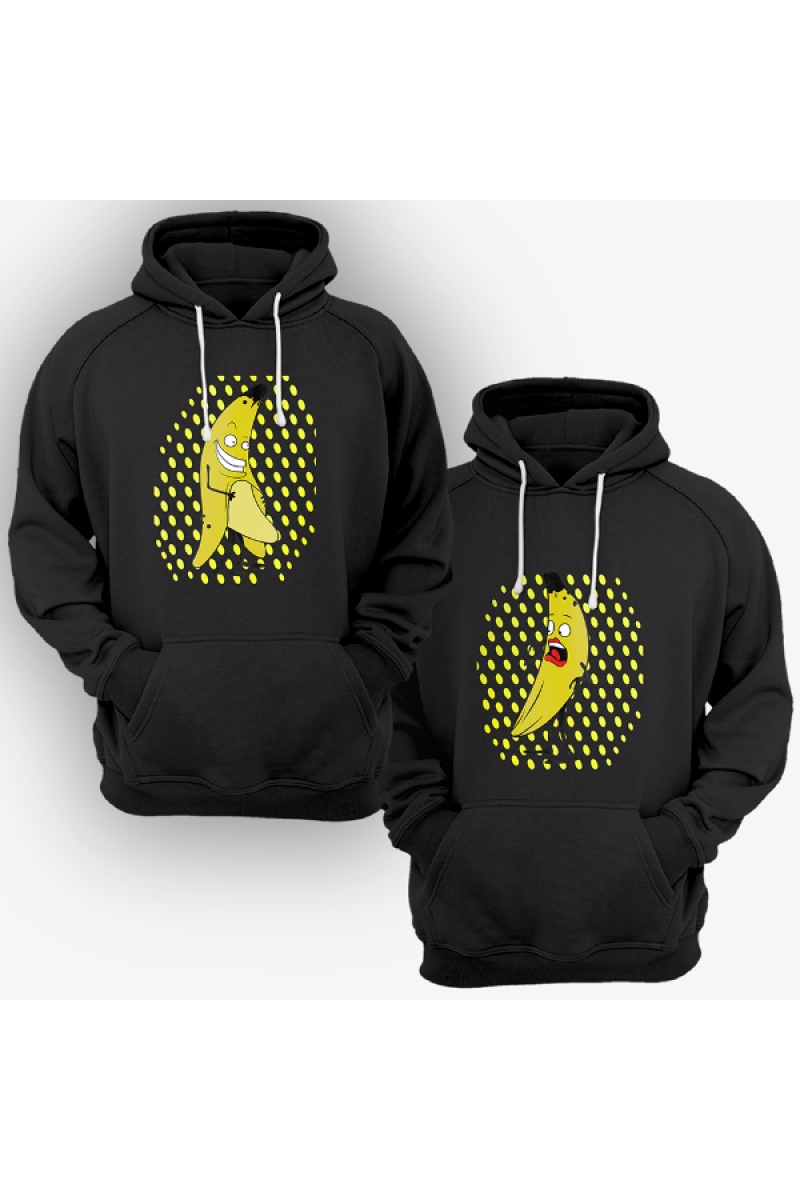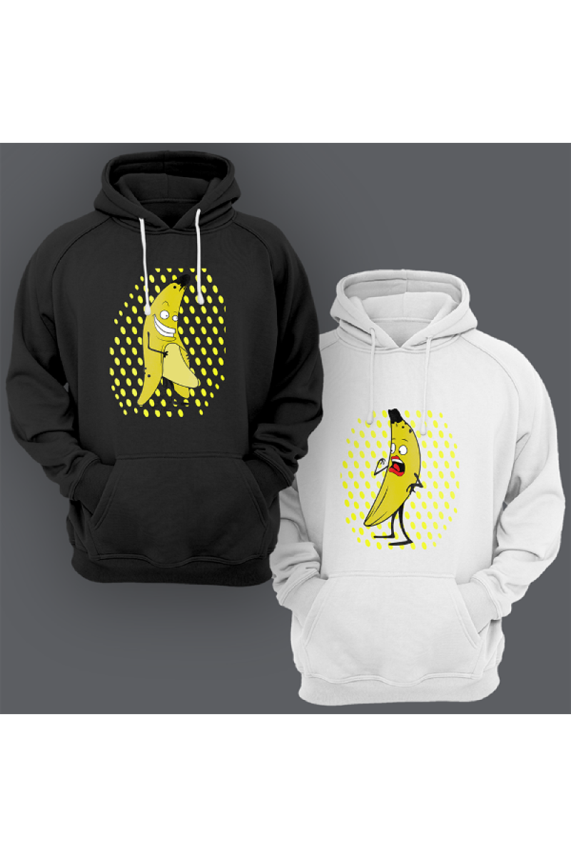 Парные толстовки с капюшоном для влюбленных с принтом на котором мужчина-банан показывает что у него под кожурой, а женщина-банан удивляется.