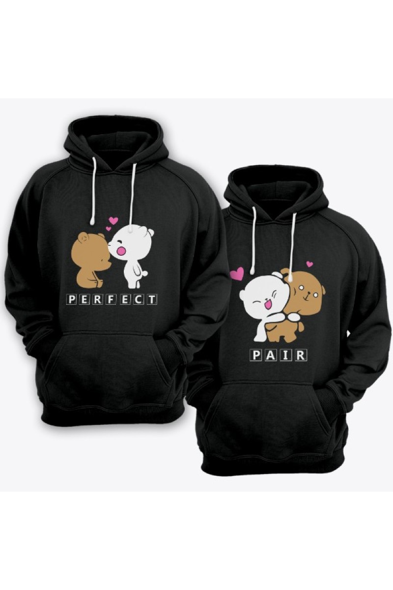 Парные толстовки с капюшоном для влюбленных с надписями "Perfect" - лучшая и "Pair" - пара. Помимо надписей на принте есть смешные рисунки белого и бурого мишек.