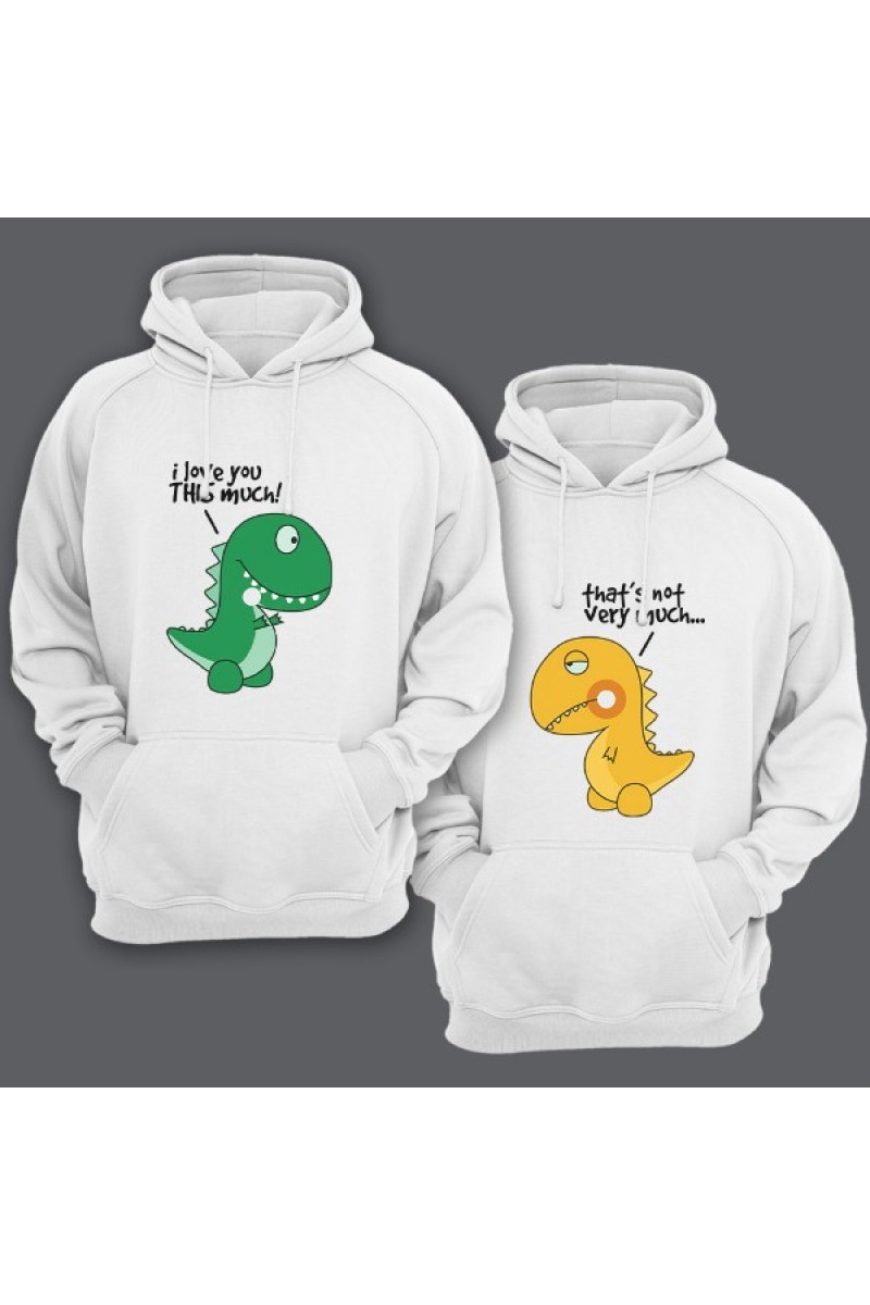 Парные толстовки с капюшоном для влюбленных с надписями "I love you THIS much" ("Я люблю тебя ВОТ так") для него и "That's not so much" ("Этого не достаточно..") для неё. Помимо надписи на принте есть рисунок динозавриков, на мужской зеленый, на женской желтый.