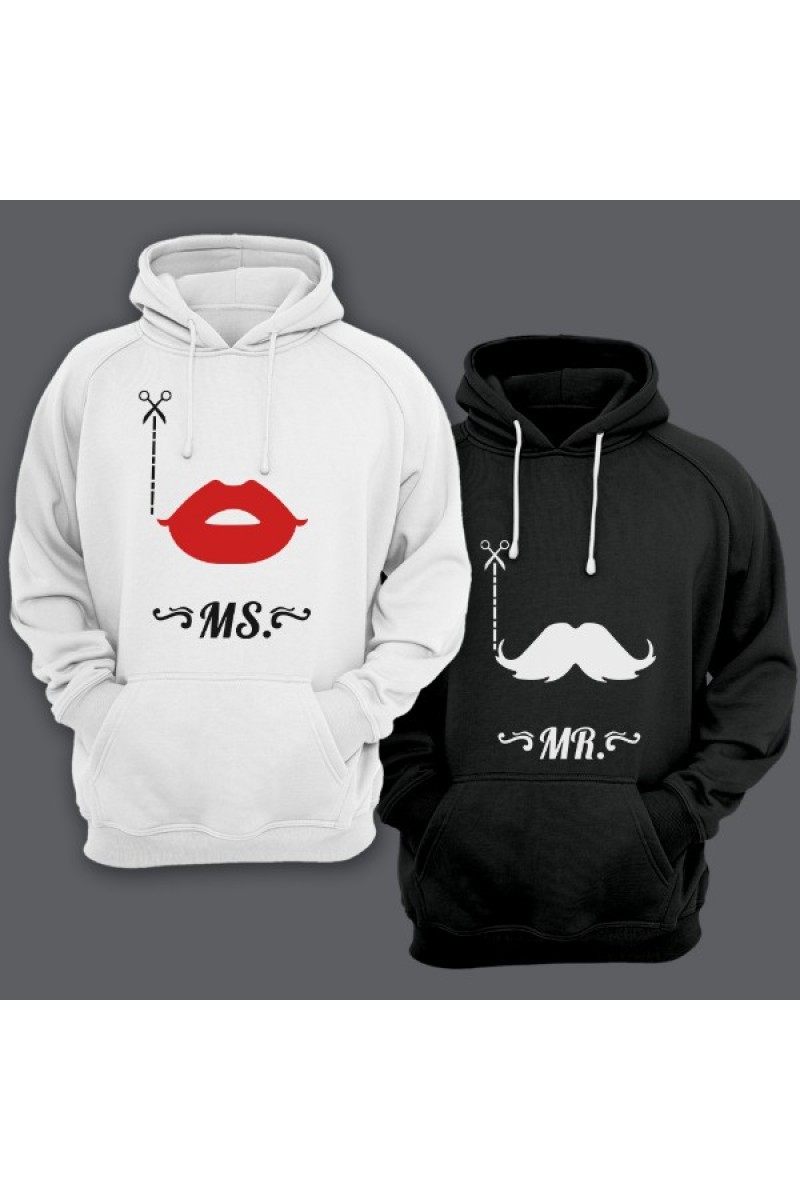 Парные толстовки с капюшоном для влюбленных с надписями "Mr" для него и "Ms" для неё. Помимо надписи на принте есть изображения красных губ и усов.