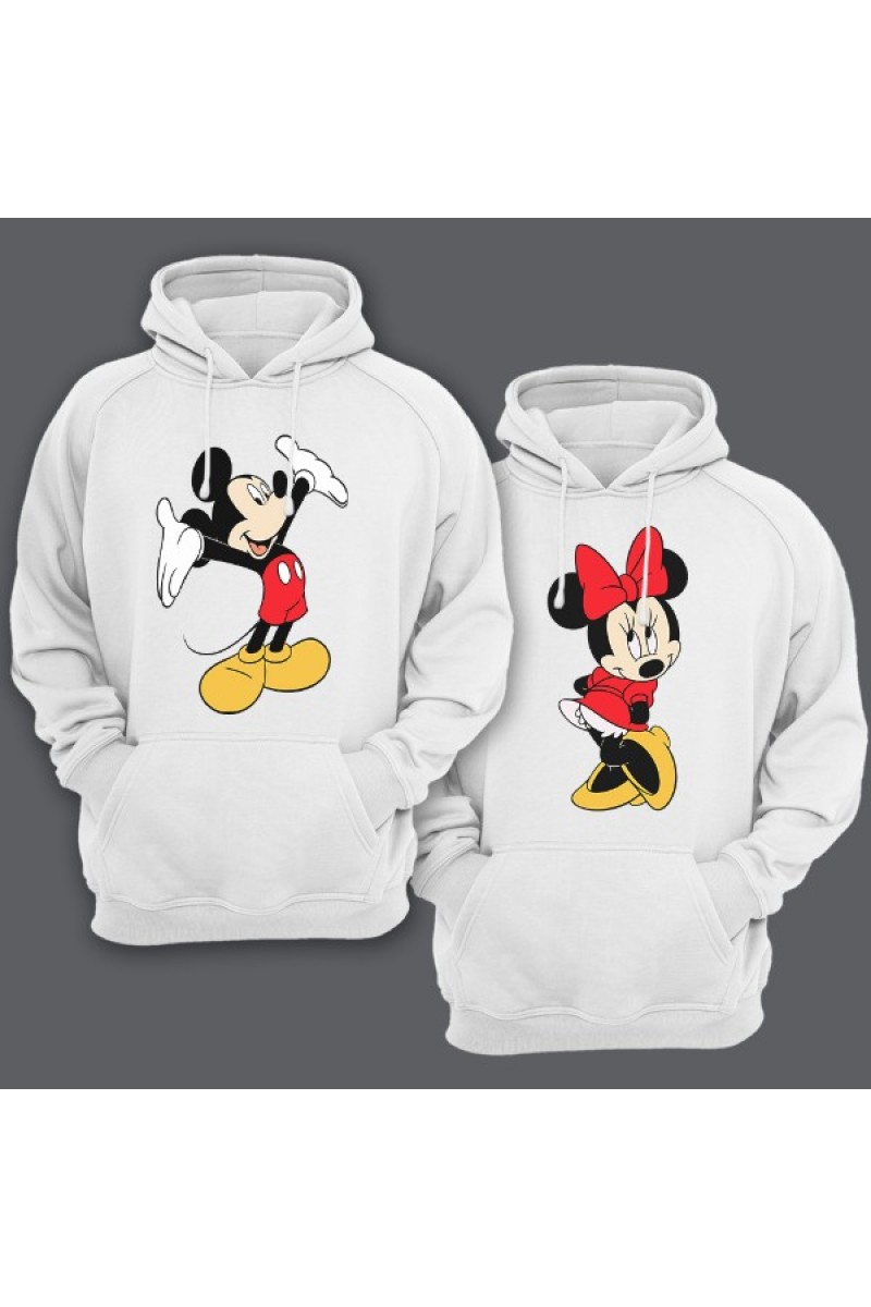 Парные толстовки с капюшоном для влюбленных с рисунками Микки Мауса и Мини Маус из мультика Mickey Mouse от Disney.