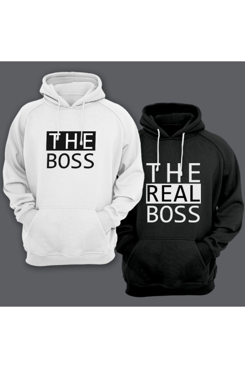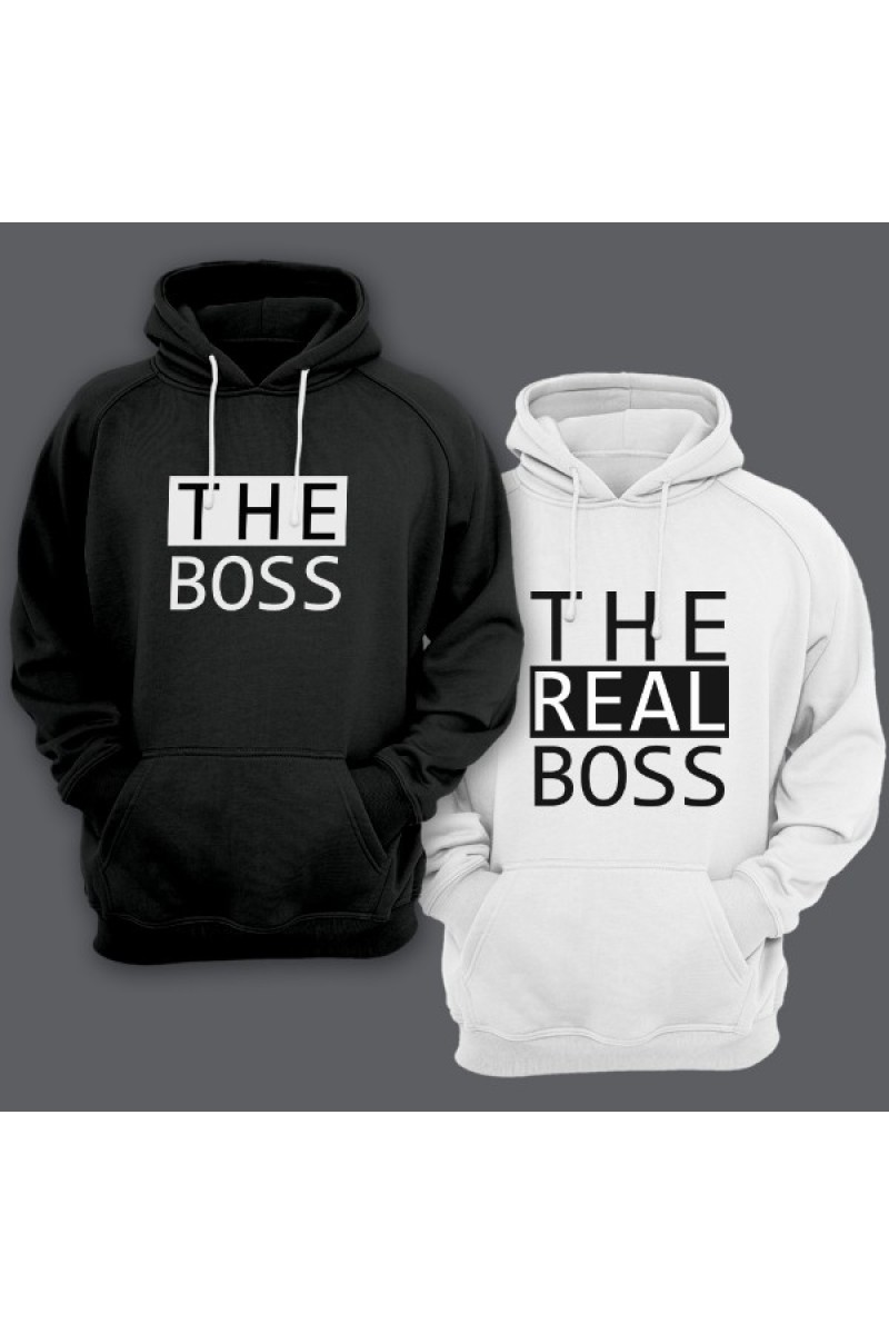 Парные толстовки с капюшоном для влюбленных с надписями "The boss" (Босс) - для него и "The real boss" (Настоящий босс) - для неё.