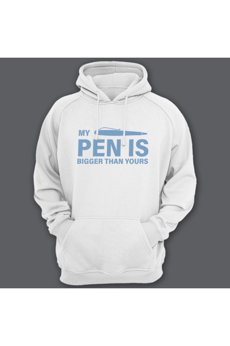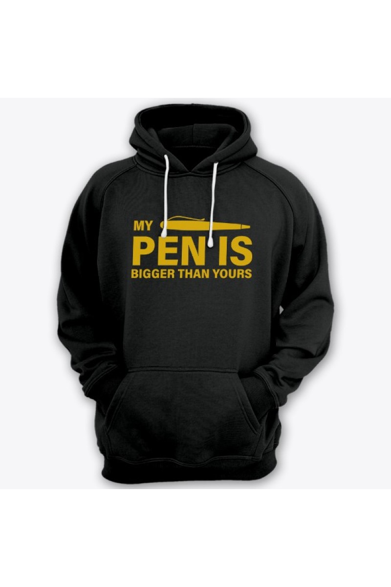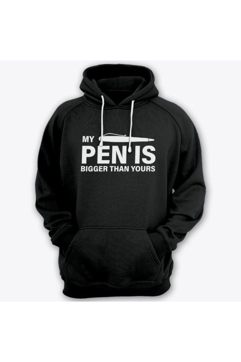Смешная толстовка с капюшоном с надписью "My pen is bigger than yours" - Моя ручка больше твоей. Игра слов - "Pen" на английском ручка, поэтому дословно перевести фразу нельзя. Если читать фразу вслух получится "Мой пенис больше твоего".