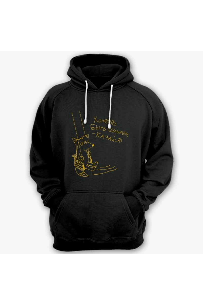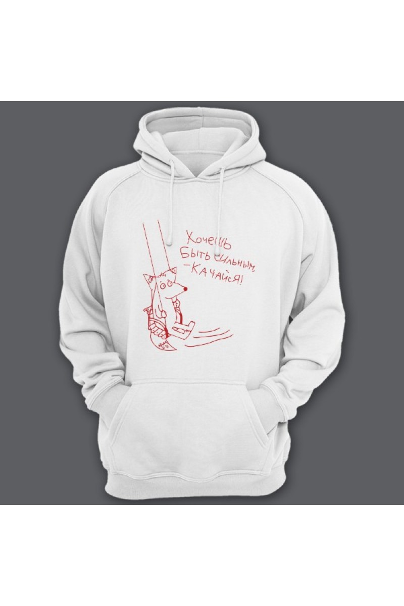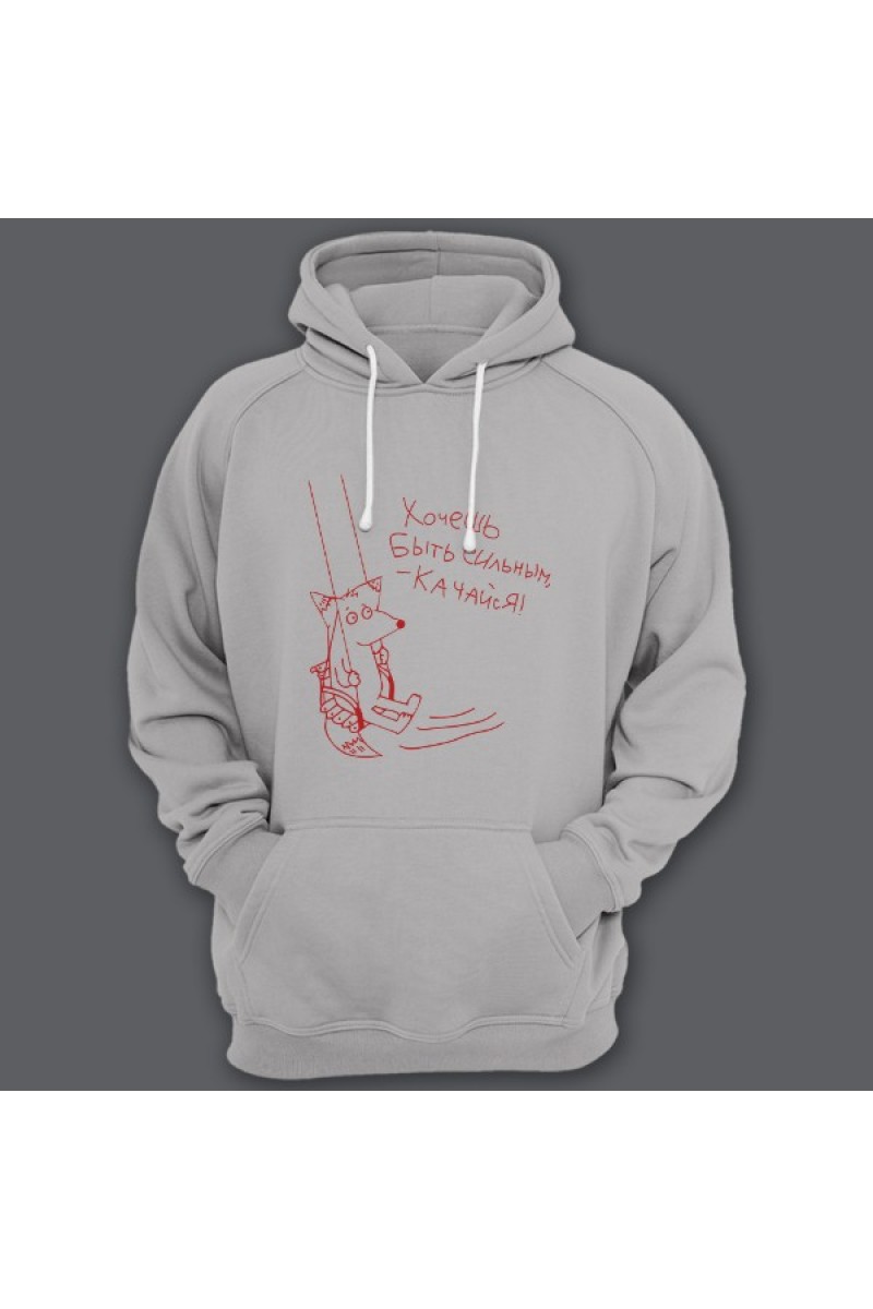 Прикольная толстовка с капюшоном с надписью "Хочешь быть сильным - качайся"