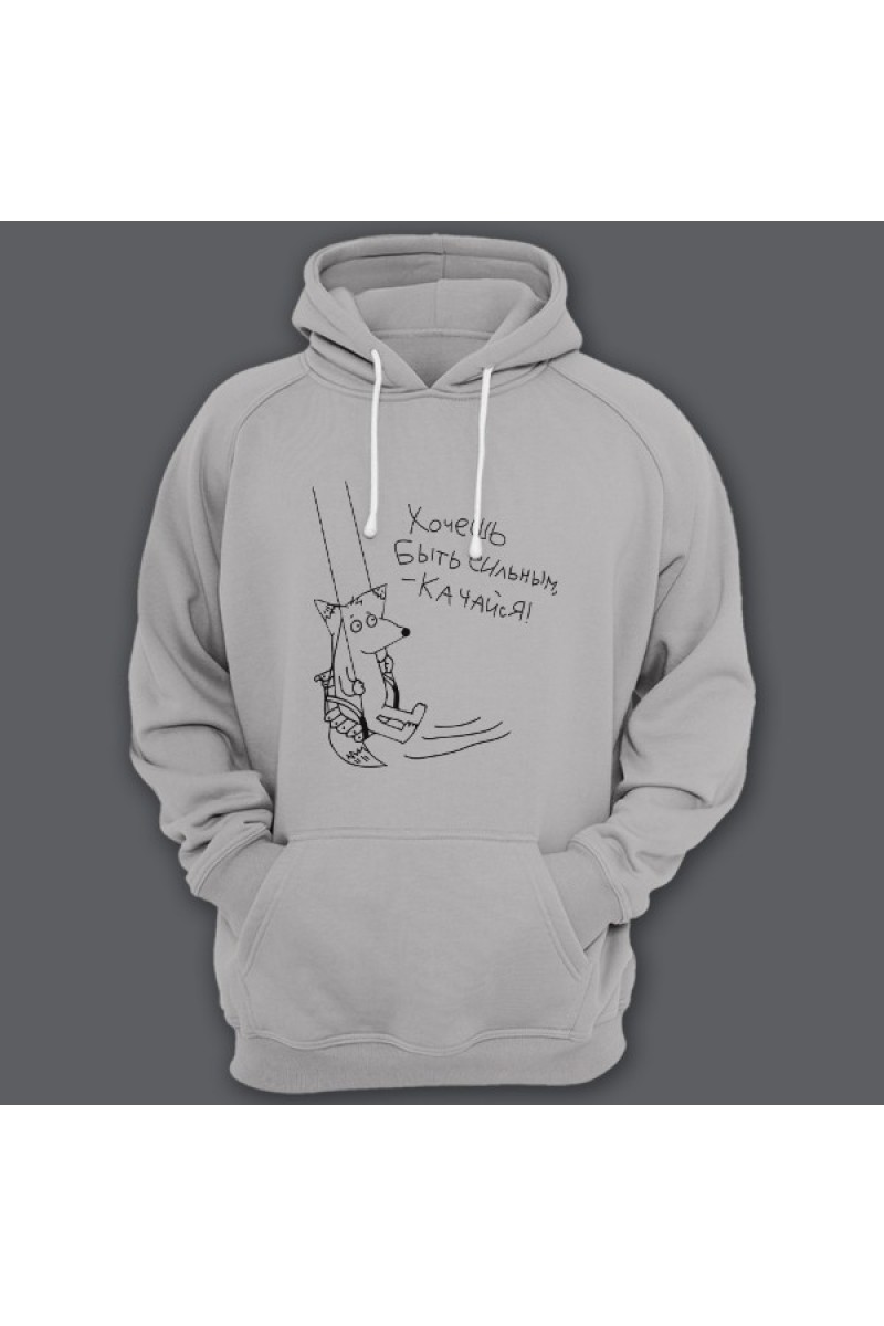 Смешная толстовка с капюшоном с надписью "Хочешь быть сильным - качайся" и прикольным принтом лисы, качающейся на качелях.