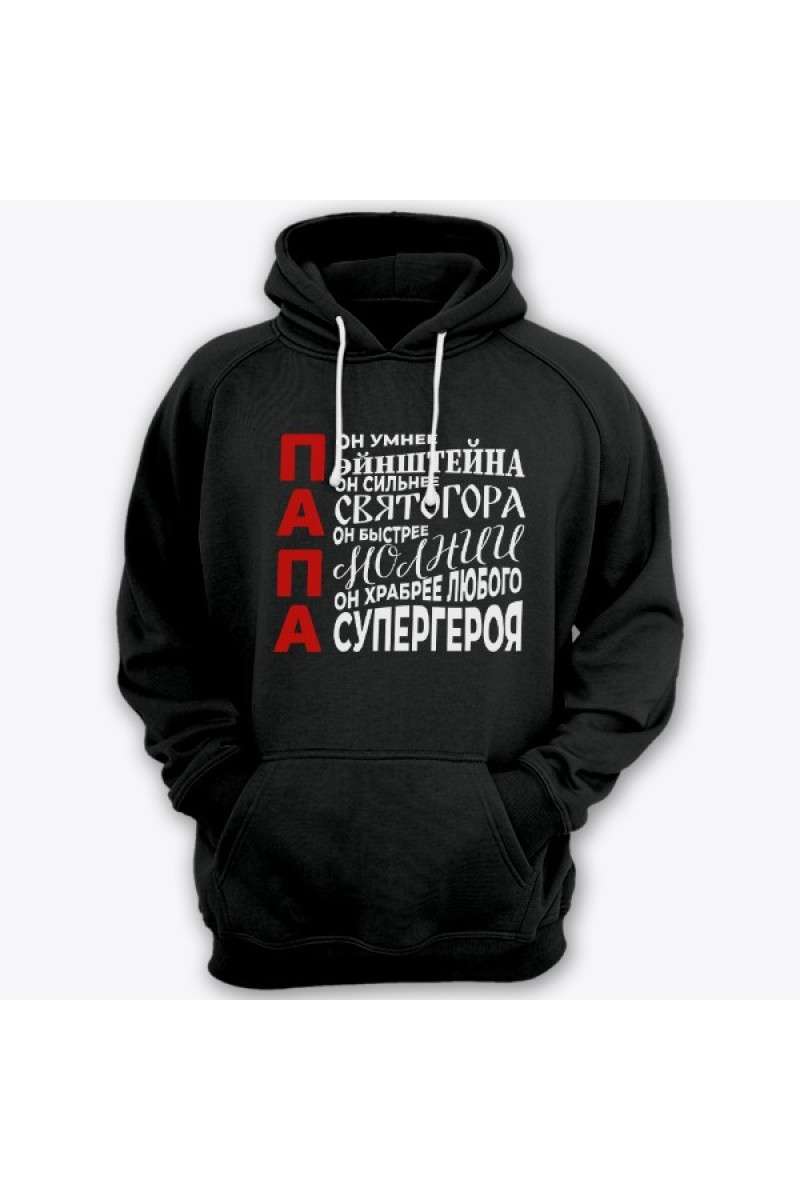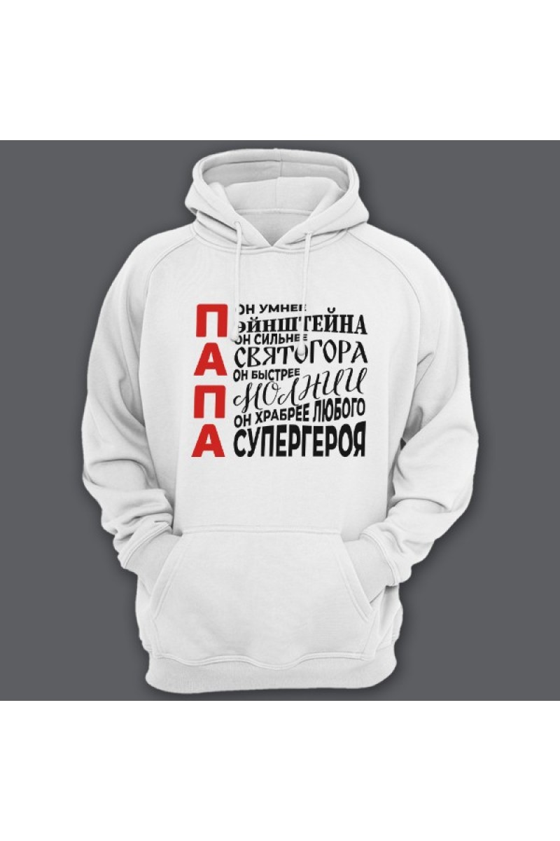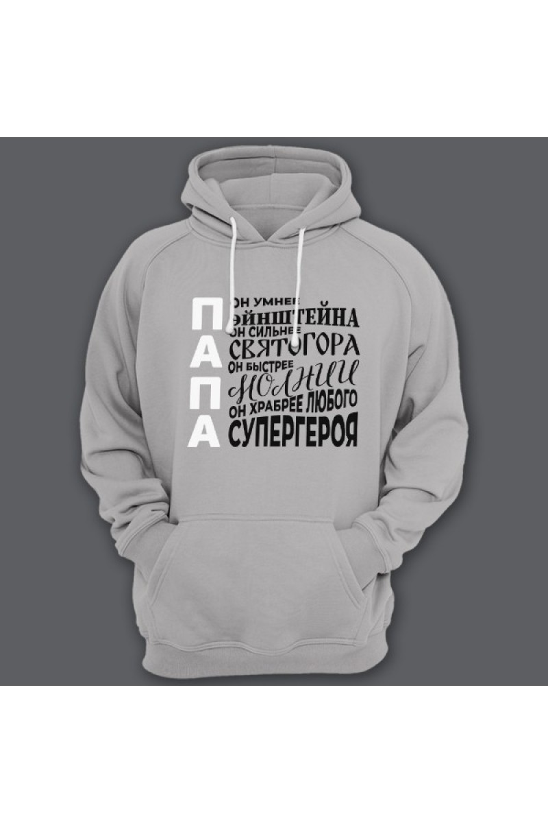 Подарочная толстовка для папы с надписями "Он умнее Эйнштейна", "Он сильнее Святогора", "Он быстрее молнии", "Он храбрее любого супергероя"