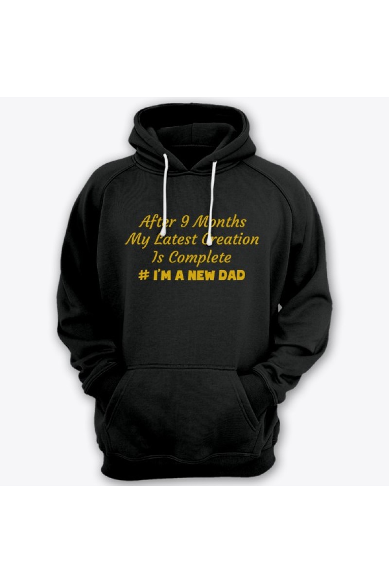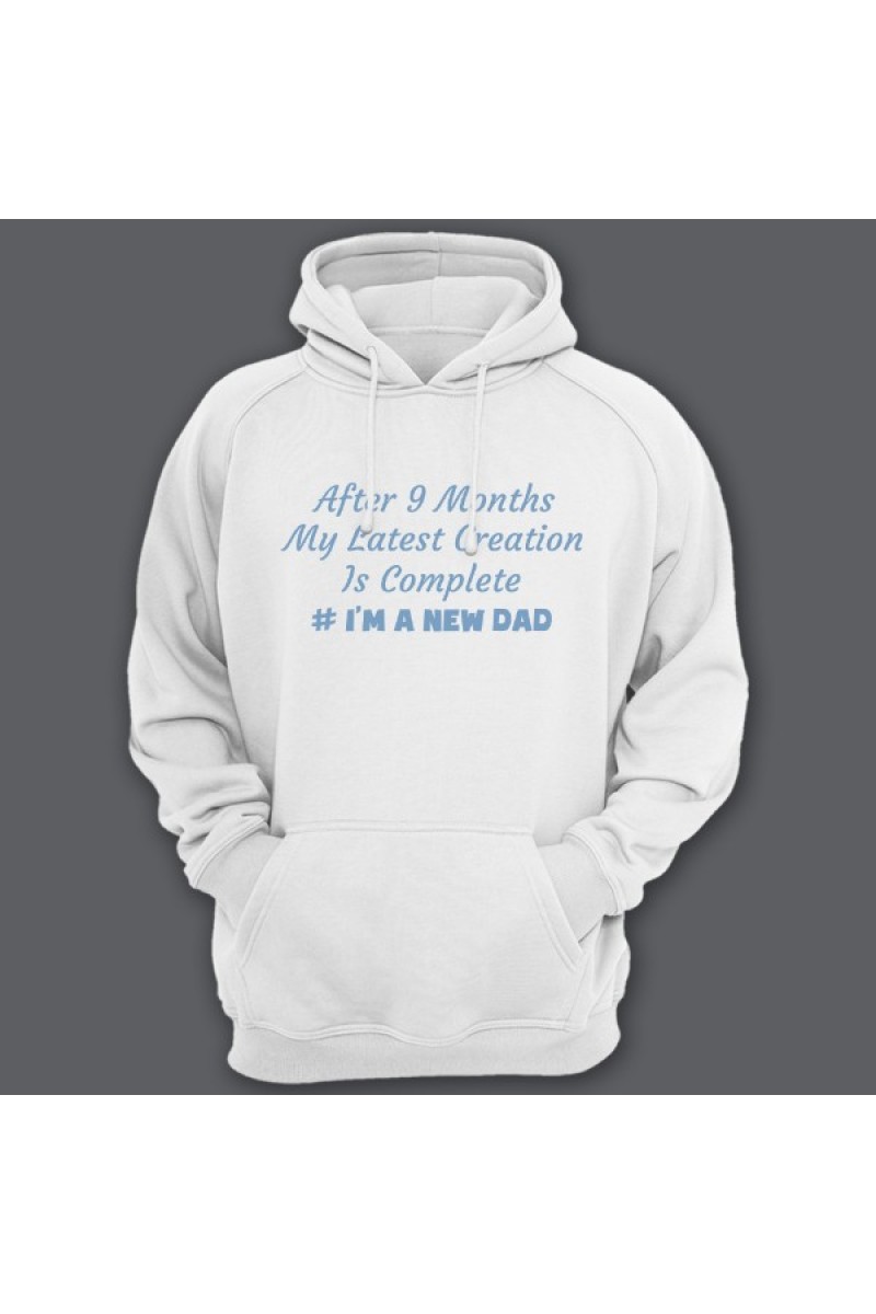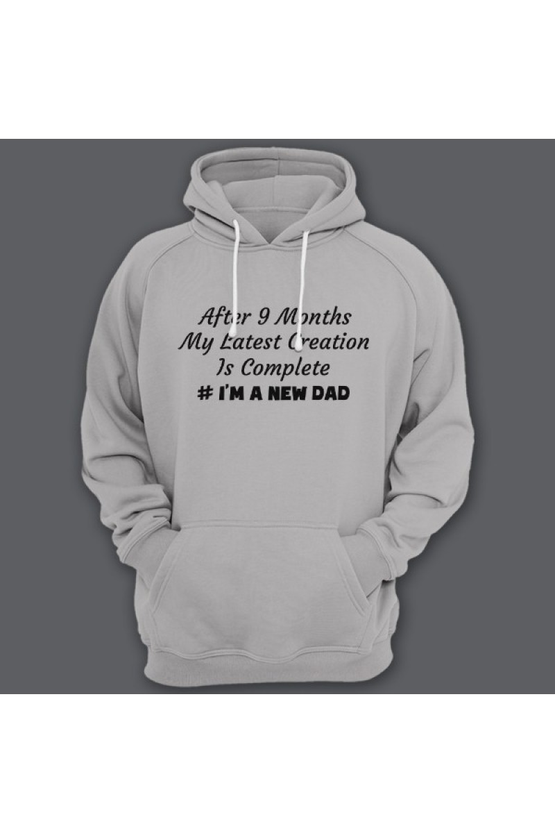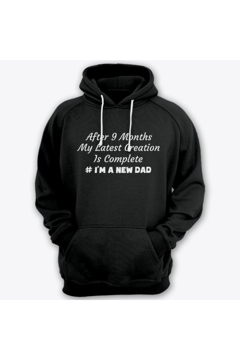 Веселая подарочная толстовка для папы. "After 9 months my latest creation is complete #I'm a new dad" - После 9 месяцев мое последние творение завершено. #Я новый папа.