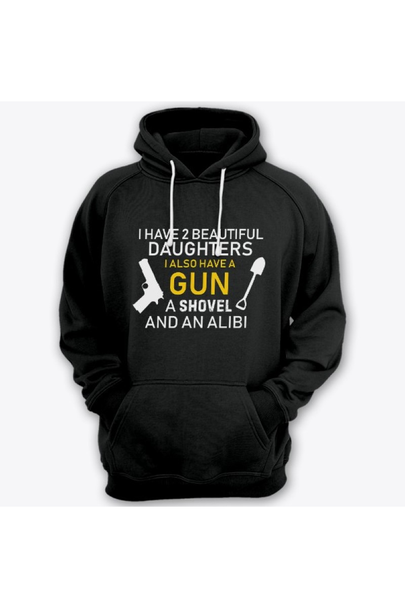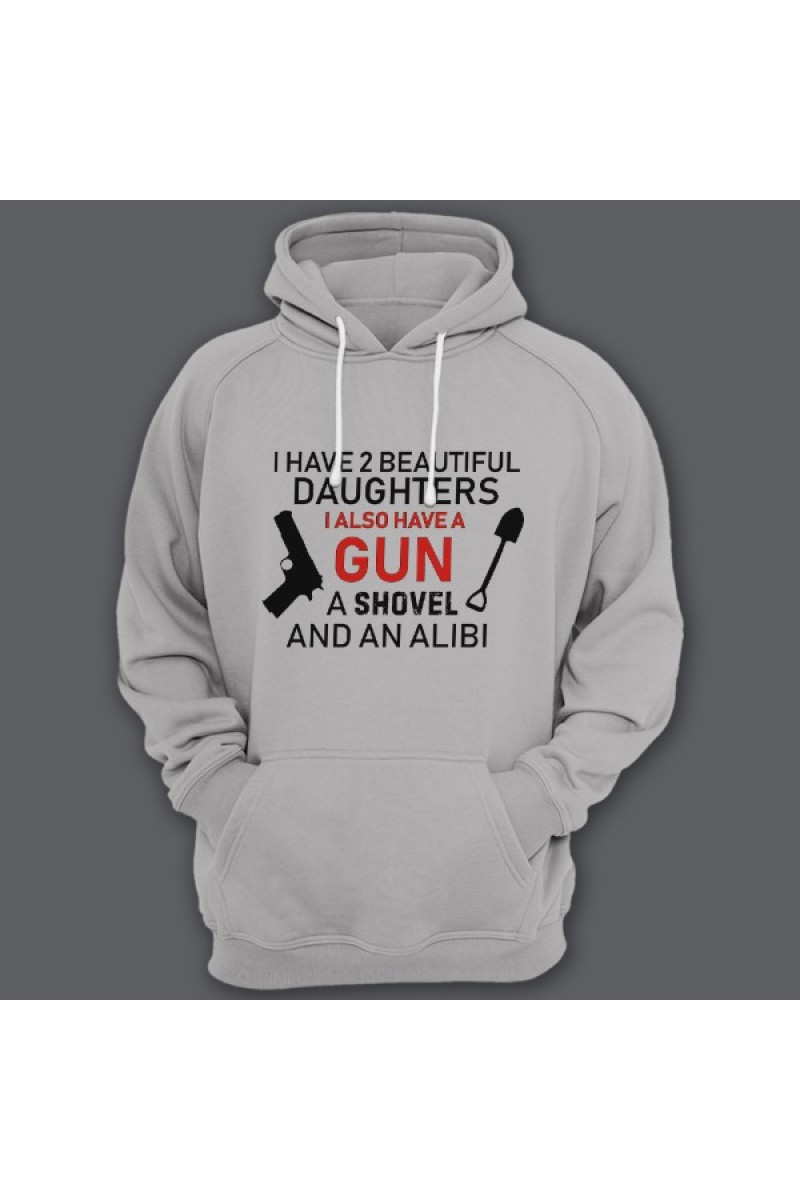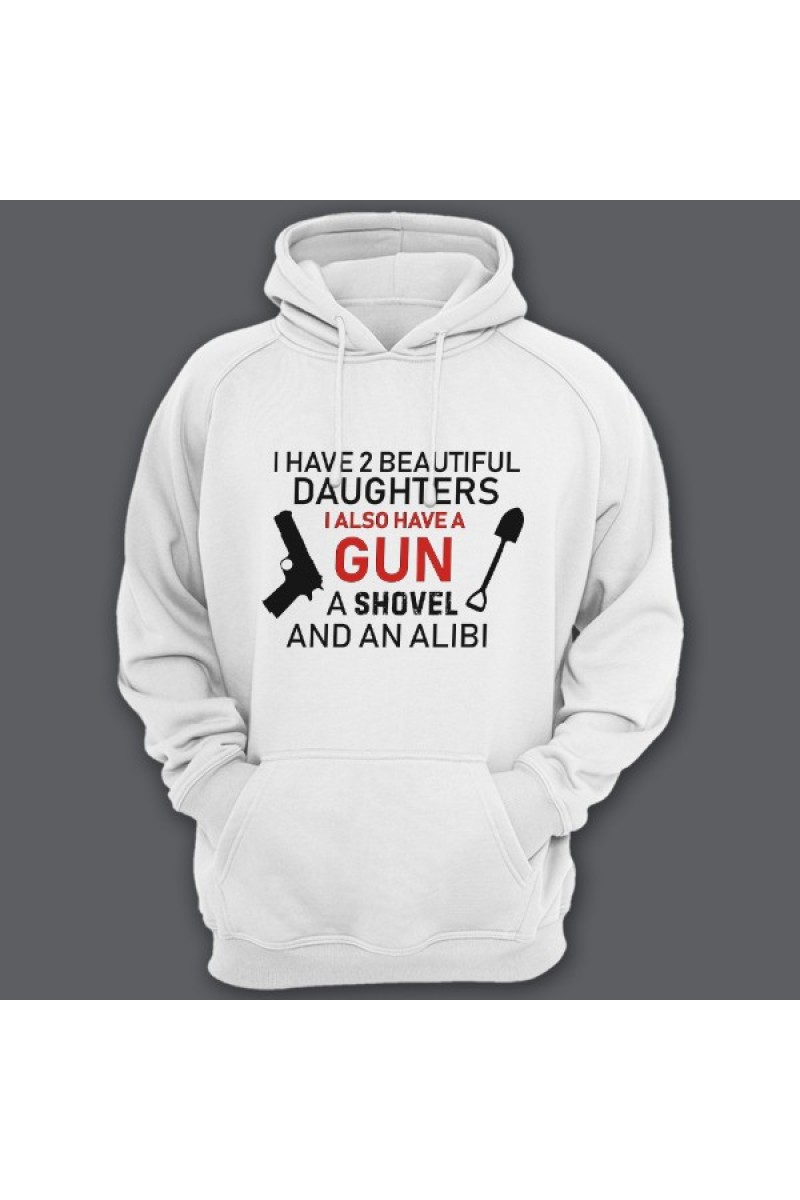 Толстовка для папы с надписью "I have 2 beautiful daughters. I also have a gun, a shovel and an alibi"