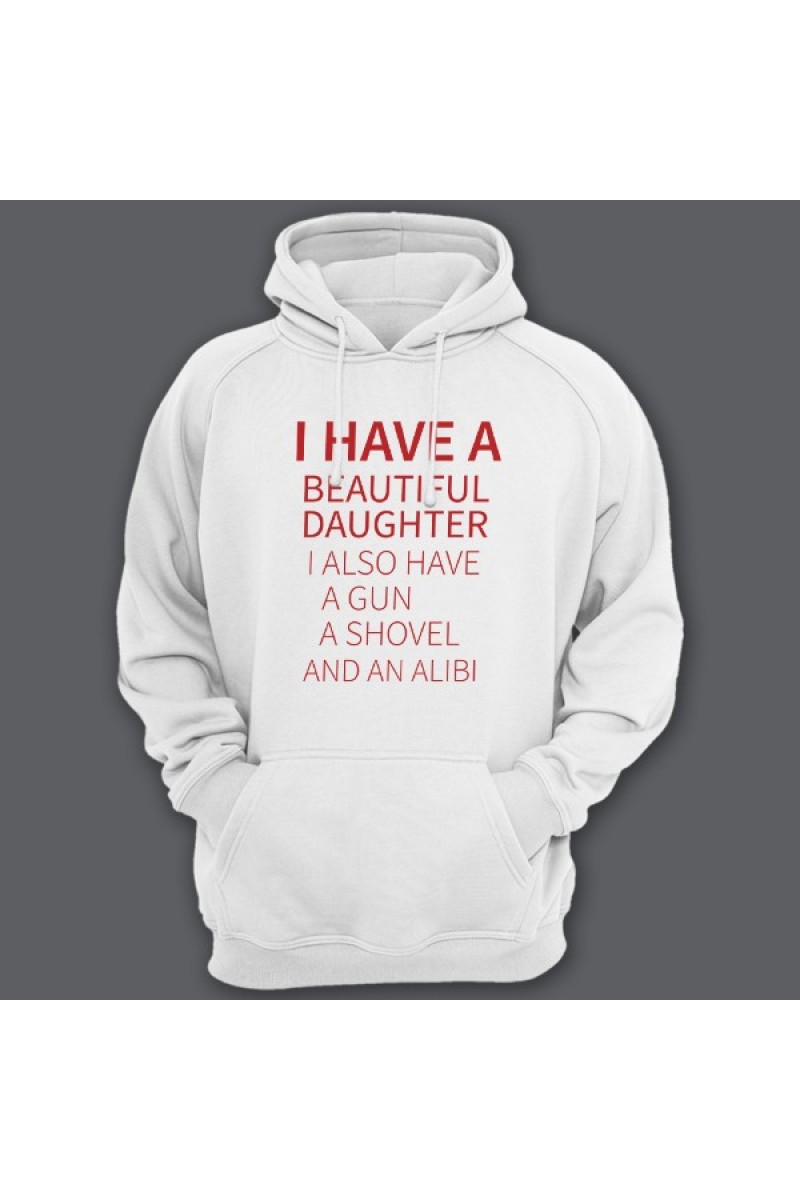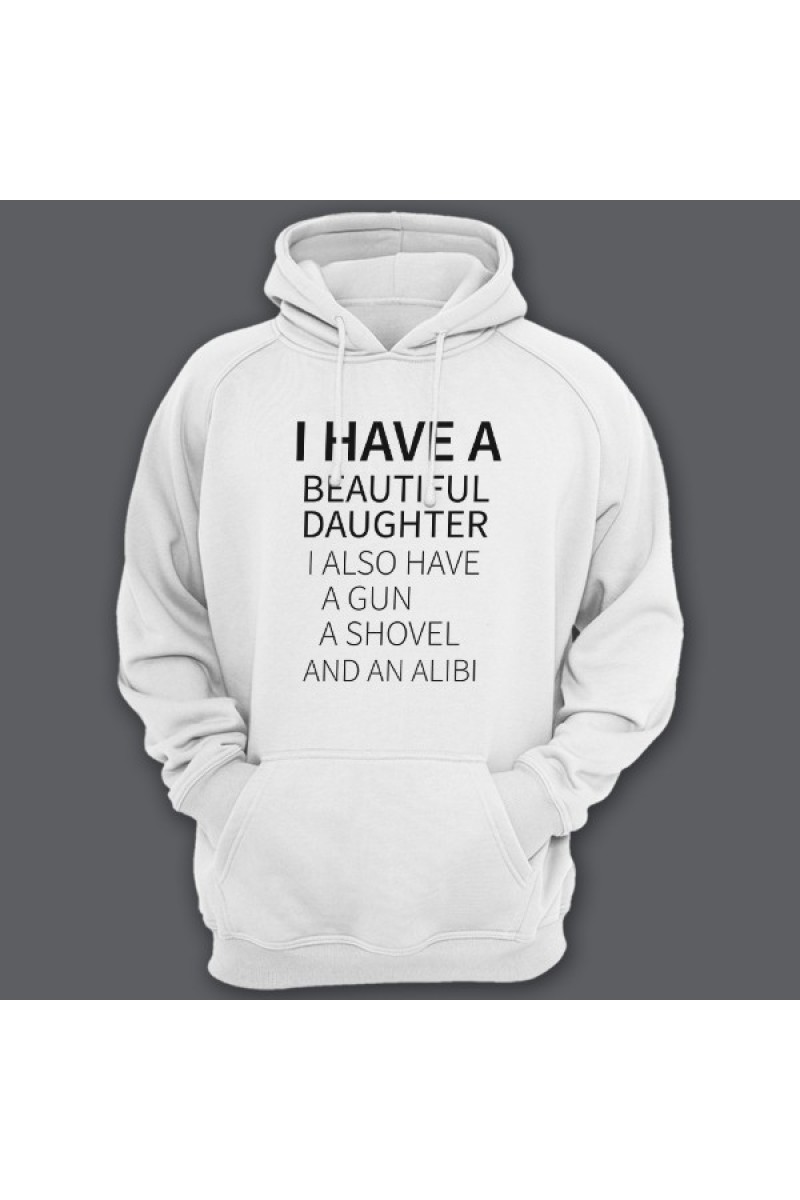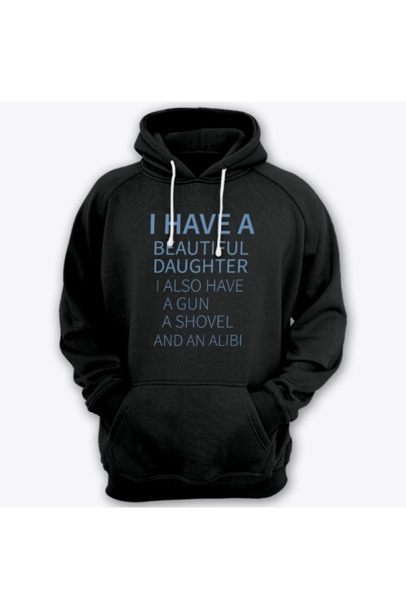 Толстовка для папы с надписью "I have a beautiful daughter. I also have a gun, a shovel and an alibi"
