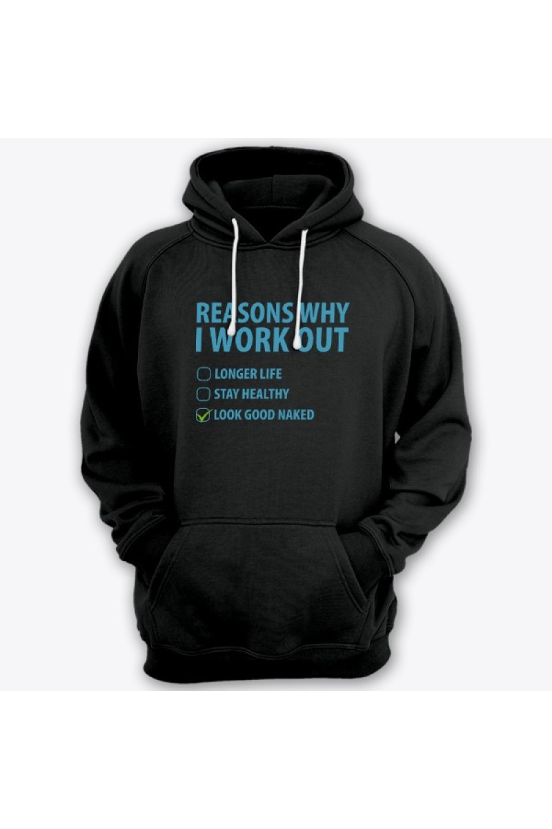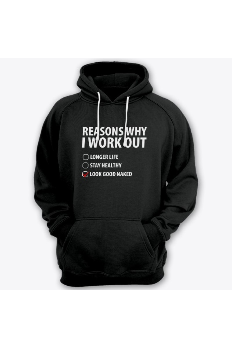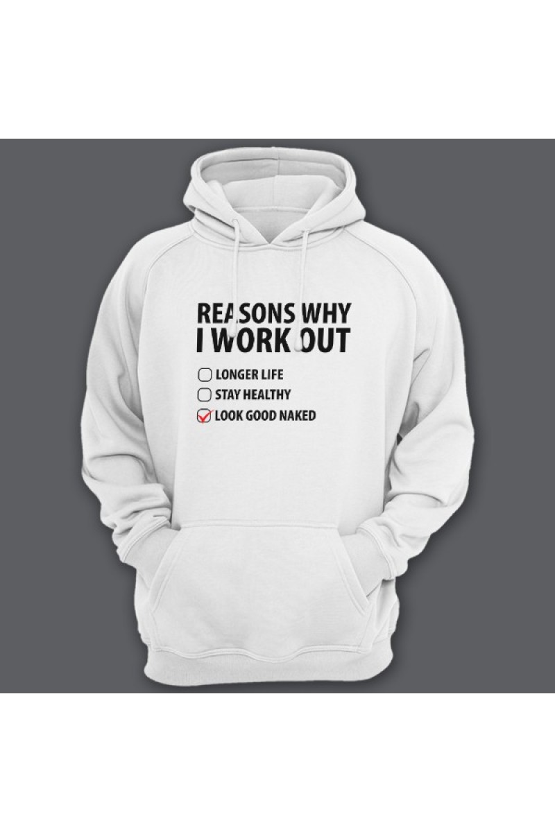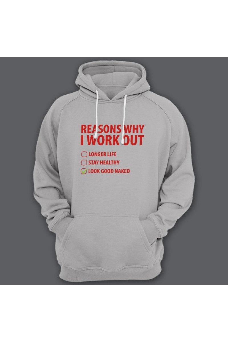 Смешная толстовка с капюшоном с надписью "Reasons why i workout" ("Причины по которым я качаюсь") :