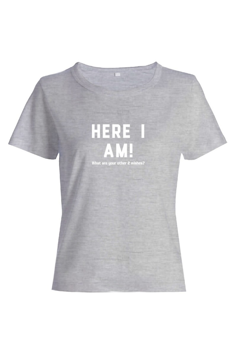 Футболка для женщины с забавным текстом "Here i am". Настало время шоппинг-террапии. Такая покупка способна поднять даже самое плохое настроение. В большой компании у вас велик шанс, что вы привлечете к себе внимание. Смешные футболки определенно им понравятся. Не забудьте рассказать дорогим друзьям, где вы раздобыли такое сокровище. Чем отличаются женские футболки от мужских? Они приталенные, а вырез увеличен. Одежда натуральна, 100% хлопок. Порадуйте такой футболкой лучшую подругу или сестру. Можете приобрести одинаковые - станьте роднее, почувствуйте себя близнецами, которых некоторые так любят одевать одинаково. Чтобы футболка подарила вам заряд счастья, выберите правильный размер. В нашем магазине футболки идут размер в размер. На сайте имеется таблица размеров. Уточните размер, ведь маленькая футболка вам точно не нужна, купите свободную. Пусть будет на размер больше, а не меньше.