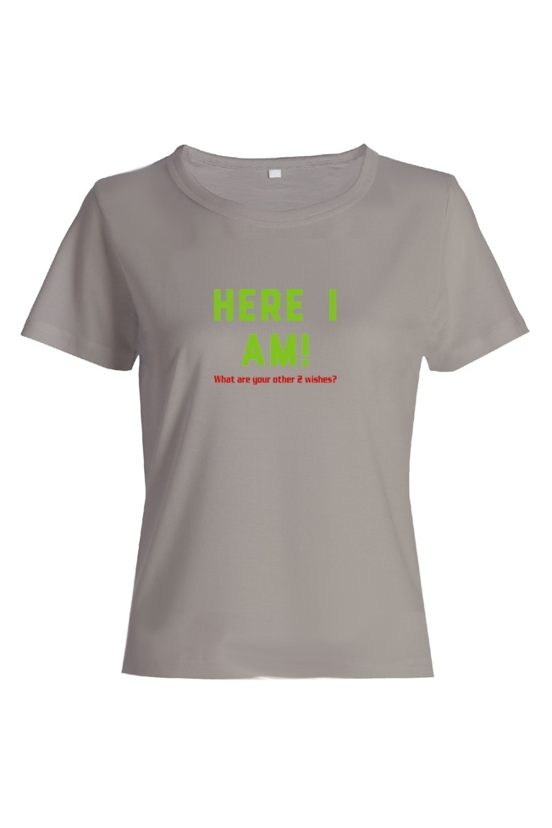 Футболка для женщины с забавным текстом "Here i am". Настало время шоппинг-террапии. Такая покупка способна поднять даже самое плохое настроение. В большой компании у вас велик шанс, что вы привлечете к себе внимание. Смешные футболки определенно им понравятся. Не забудьте рассказать дорогим друзьям, где вы раздобыли такое сокровище. Чем отличаются женские футболки от мужских? Они приталенные, а вырез увеличен. Одежда натуральна, 100% хлопок. Порадуйте такой футболкой лучшую подругу или сестру. Можете приобрести одинаковые - станьте роднее, почувствуйте себя близнецами, которых некоторые так любят одевать одинаково. Чтобы футболка подарила вам заряд счастья, выберите правильный размер. В нашем магазине футболки идут размер в размер. На сайте имеется таблица размеров. Уточните размер, ведь маленькая футболка вам точно не нужна, купите свободную. Пусть будет на размер больше, а не меньше.