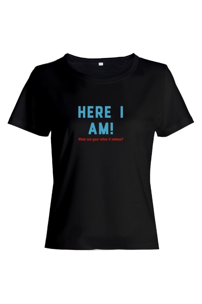 Футболка для женщины с забавным текстом "Here i am". Настало время шоппинг-террапии. Такая покупка способна поднять даже самое плохое настроение. В большой компании у вас велик шанс, что вы привлечете к себе внимание. Смешные футболки определенно им понравятся. Не забудьте рассказать дорогим друзьям, где вы раздобыли такое сокровище. Чем отличаются женские футболки от мужских? Они приталенные, а вырез увеличен. Одежда натуральна, 100% хлопок. Порадуйте такой футболкой лучшую подругу или сестру. Можете приобрести одинаковые - станьте роднее, почувствуйте себя близнецами, которых некоторые так любят одевать одинаково. Чтобы футболка подарила вам заряд счастья, выберите правильный размер. В нашем магазине футболки идут размер в размер. На сайте имеется таблица размеров. Уточните размер, ведь маленькая футболка вам точно не нужна, купите свободную. Пусть будет на размер больше, а не меньше.