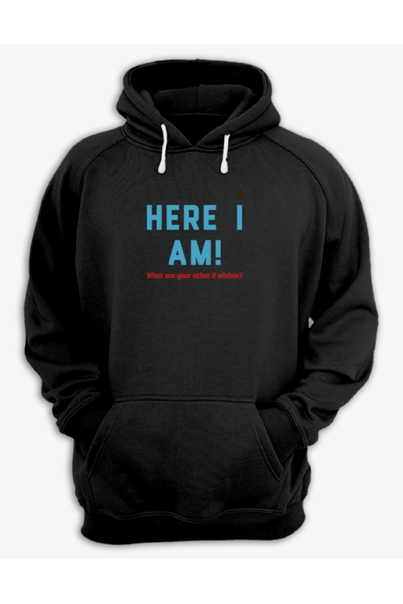 Смешная худи с классным принтом "Here i am". В наше время быть таким как все скучно. Даже одежда может выделить вас среди окружающей толпы. Худи из нашего магазина привлекут внимание, ведь они не простые, а со смешными надписями и клевыми принтами. Стильные худи хотят все. Покупайте себе, дарите друзьями, радуйте близких. У нас есть все и для всех. Найдете и для сына, и для отца, и про себя не забудьте. А в разделе женских худи вы найдете что-то и для представительниц прекрасного пола. Это весьма полезный подарок, который к тому же будет напоминать о вас. Ткань худи - чистый хлопок, 100%. Хлопковая ткань самая лучшая. Носить такое худи - это одно сплошное удовольствие. Вы главное не промахнитесь з размером. На сайте указаны женские размеры, а мужские - на 1-2 размера больше. Покупайте худи с запасом в размере - так надежнее. Свободные кофты с длинными рукавами такие потрясные.