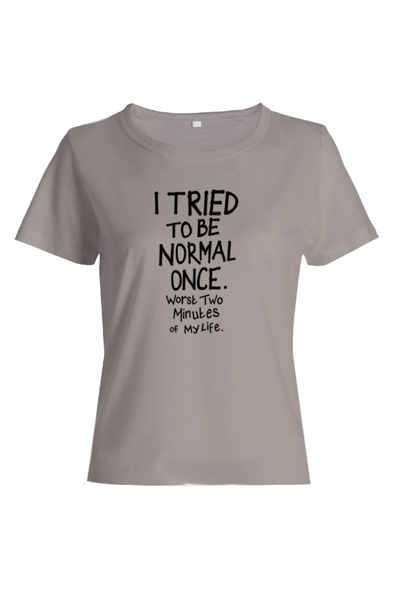 Футболка для женщины с забавным текстом "I tried to be normal once". Настало время шоппинг-террапии. Такая покупка способна поднять даже самое плохое настроение. В большой компании у вас велик шанс, что вы привлечете к себе внимание. Смешные футболки определенно им понравятся. Не забудьте рассказать дорогим друзьям, где вы раздобыли такое сокровище. Чем отличаются женские футболки от мужских? Они приталенные, а вырез увеличен. Одежда натуральна, 100% хлопок. Порадуйте такой футболкой лучшую подругу или сестру. Можете приобрести одинаковые - станьте роднее, почувствуйте себя близнецами, которых некоторые так любят одевать одинаково. Чтобы футболка подарила вам заряд счастья, выберите правильный размер. В нашем магазине футболки идут размер в размер. На сайте имеется таблица размеров. Уточните размер, ведь маленькая футболка вам точно не нужна, купите свободную. Пусть будет на размер больше, а не меньше.