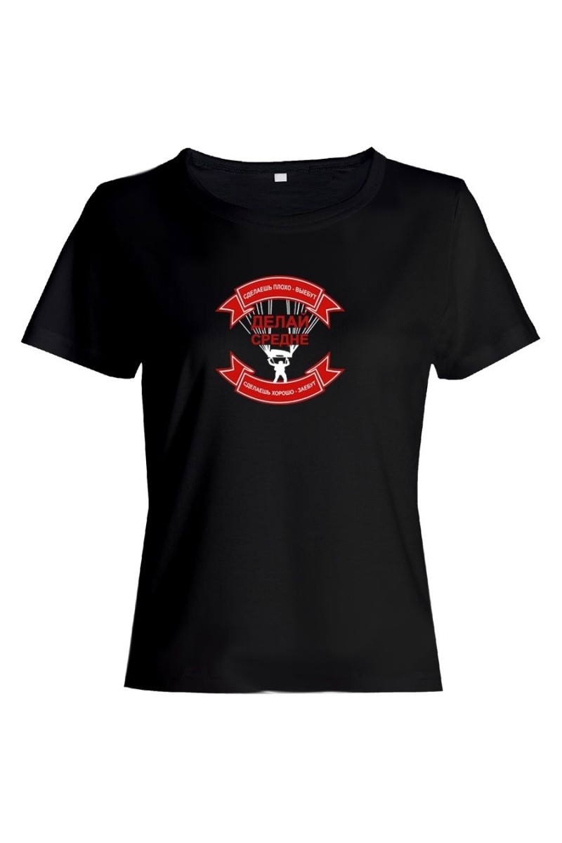 Футболка для женщины с забавным текстом "Делай средне". Настало время шоппинг-террапии. Такая покупка способна поднять даже самое плохое настроение. В большой компании у вас велик шанс, что вы привлечете к себе внимание. Смешные футболки определенно им понравятся. Не забудьте рассказать дорогим друзьям, где вы раздобыли такое сокровище. Чем отличаются женские футболки от мужских? Они приталенные, а вырез увеличен. Одежда натуральна, 100% хлопок. Порадуйте такой футболкой лучшую подругу или сестру. Можете приобрести одинаковые - станьте роднее, почувствуйте себя близнецами, которых некоторые так любят одевать одинаково. Чтобы футболка подарила вам заряд счастья, выберите правильный размер. В нашем магазине футболки идут размер в размер. На сайте имеется таблица размеров. Уточните размер, ведь маленькая футболка вам точно не нужна, купите свободную. Пусть будет на размер больше, а не меньше.