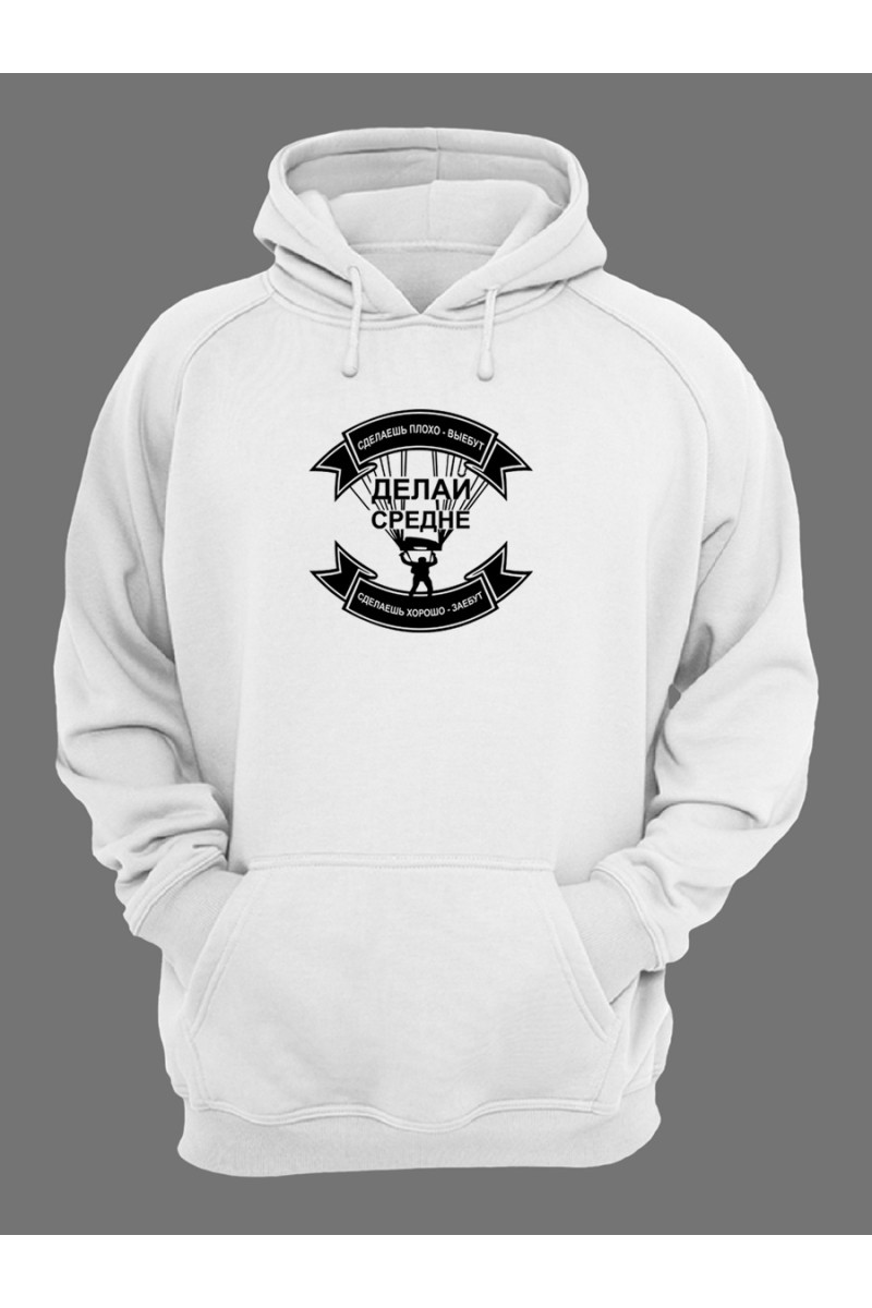 Смешная худи с классным принтом "Делай средне". В наше время быть таким как все скучно. Даже одежда может выделить вас среди окружающей толпы. Худи из нашего магазина привлекут внимание, ведь они не простые, а со смешными надписями и клевыми принтами. Стильные худи хотят все. Покупайте себе, дарите друзьями, радуйте близких. У нас есть все и для всех. Найдете и для сына, и для отца, и про себя не забудьте. А в разделе женских худи вы найдете что-то и для представительниц прекрасного пола. Это весьма полезный подарок, который к тому же будет напоминать о вас. Ткань худи - чистый хлопок, 100%. Хлопковая ткань самая лучшая. Носить такое худи - это одно сплошное удовольствие. Вы главное не промахнитесь з размером. На сайте указаны женские размеры, а мужские - на 1-2 размера больше. Покупайте худи с запасом в размере - так надежнее. Свободные кофты с длинными рукавами такие потрясные.