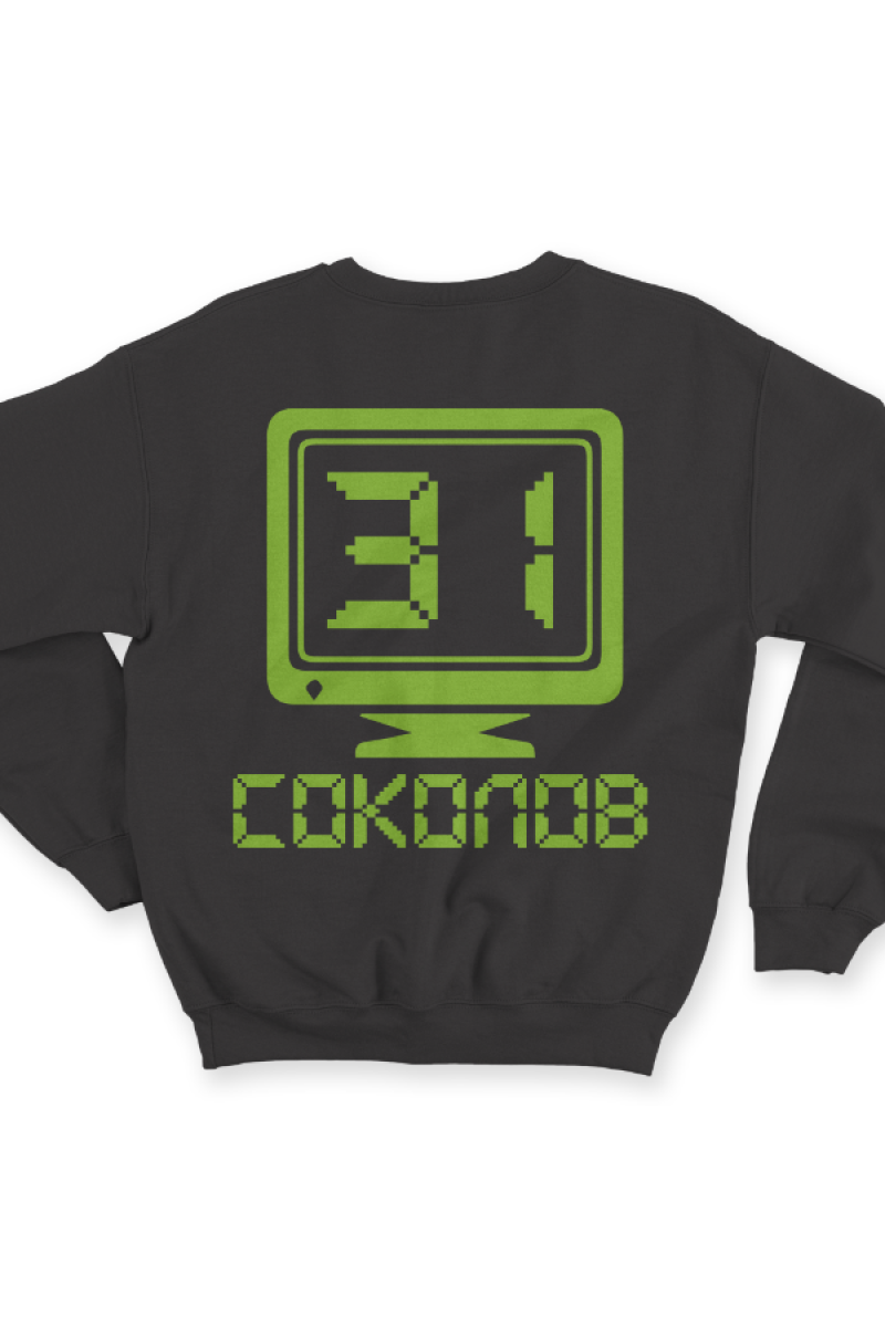 Веселый именной свитшот с аналоговым шрифтом. Помимо надписи на свитшоте есть изображение олдскульного монитора.