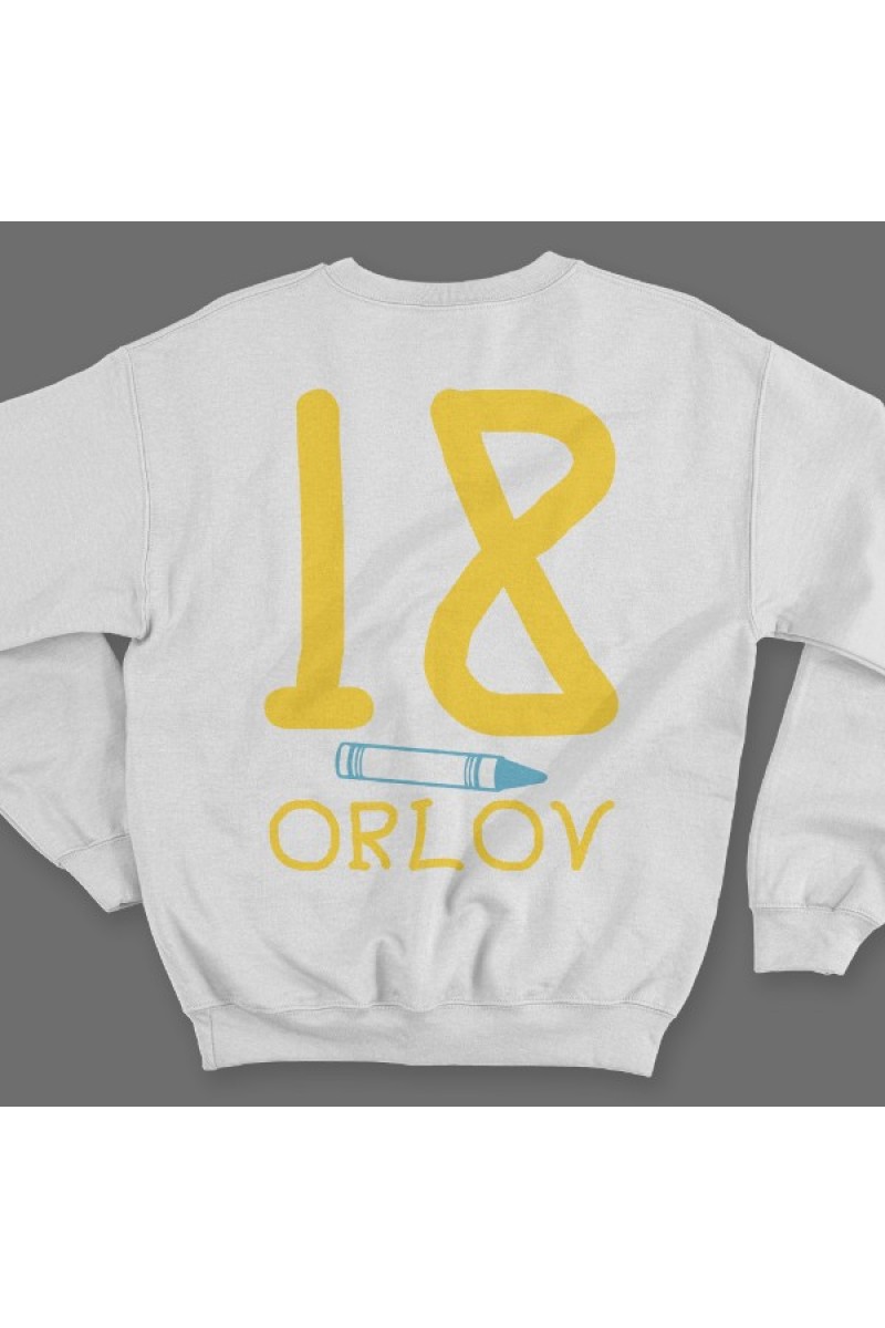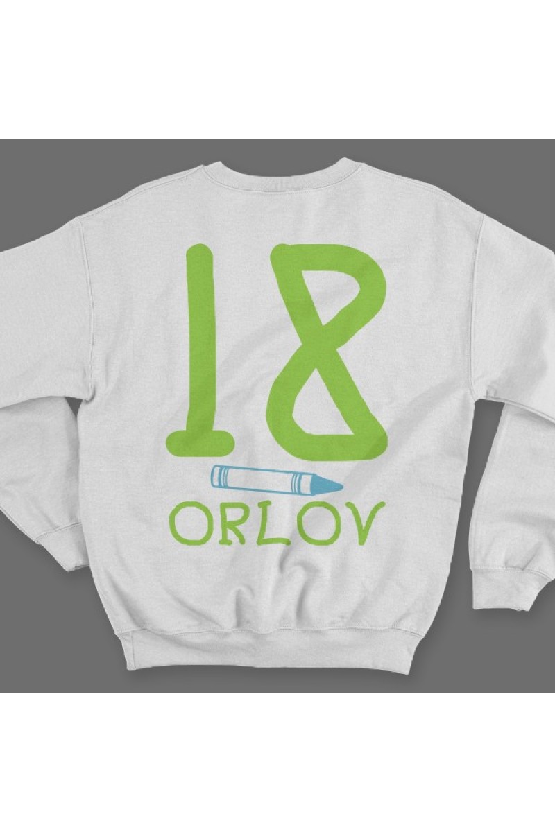 Веселый именной свитшот с детским шрифтом. Помимо надписи на свитшоте есть изображение мелков.