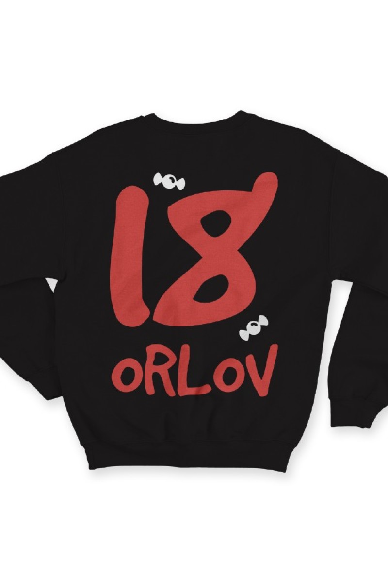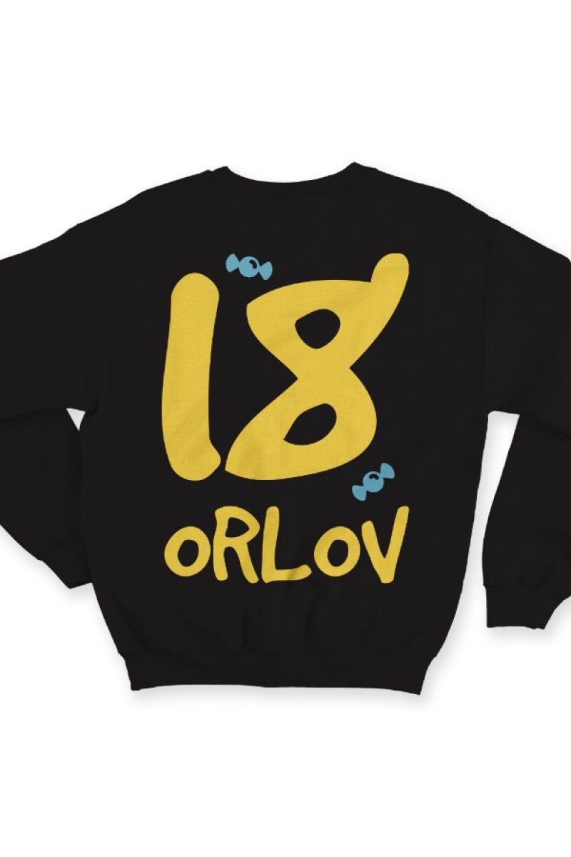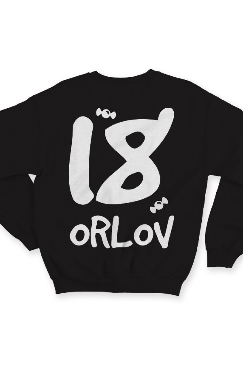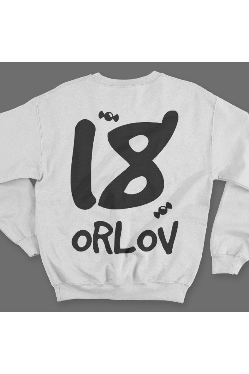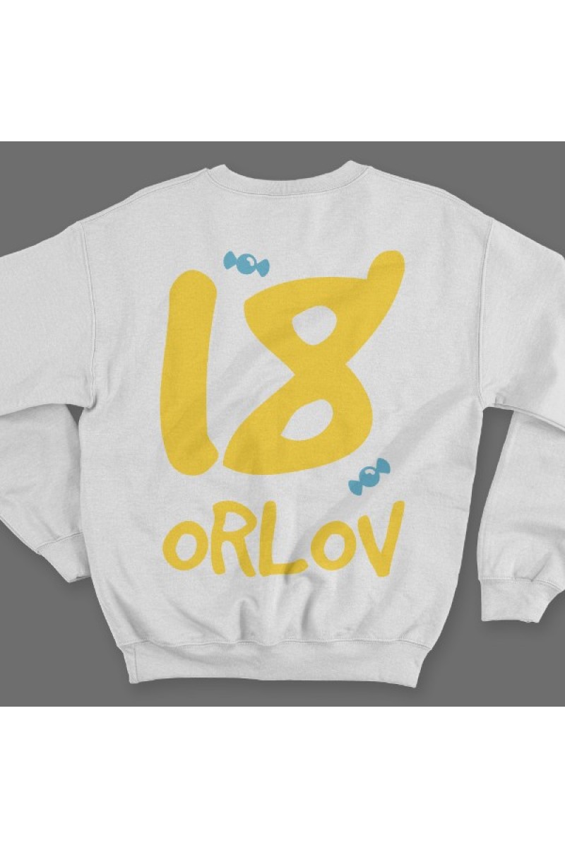 Прикольный именной свитшот с кривым шрифтом. Помимо надписи на свитшоте есть изображение конфет.