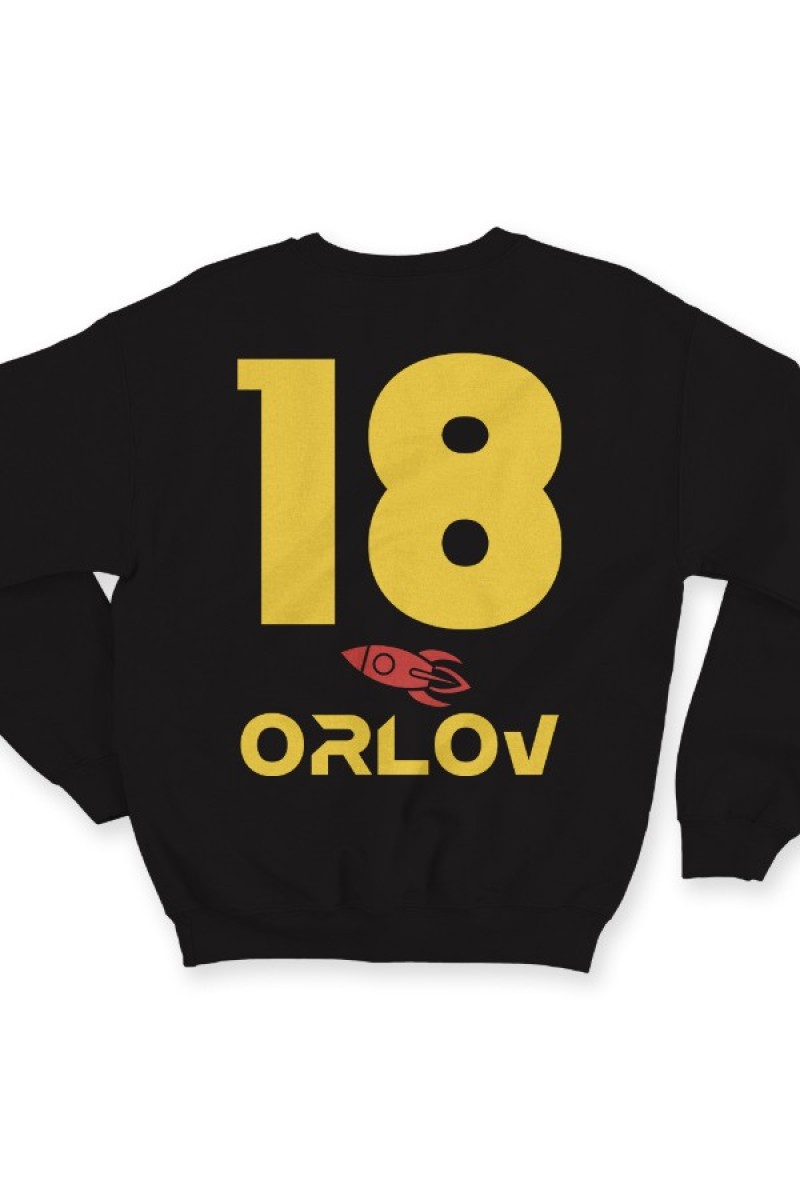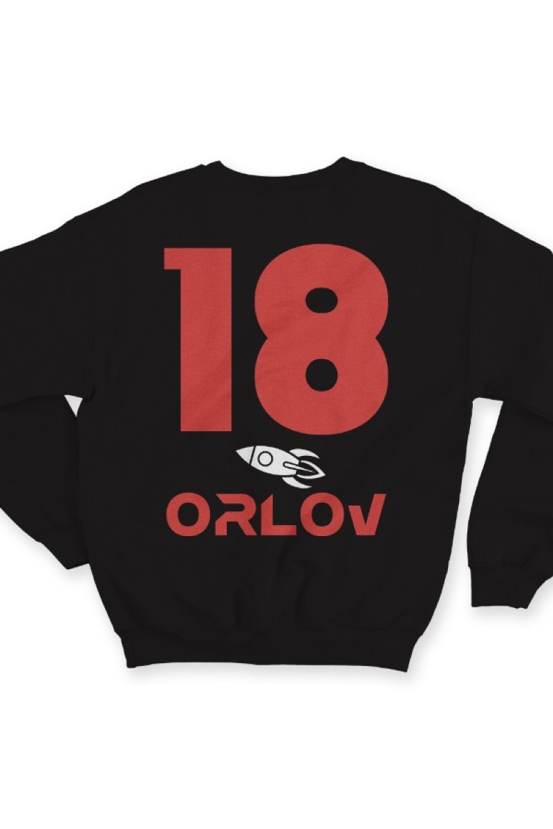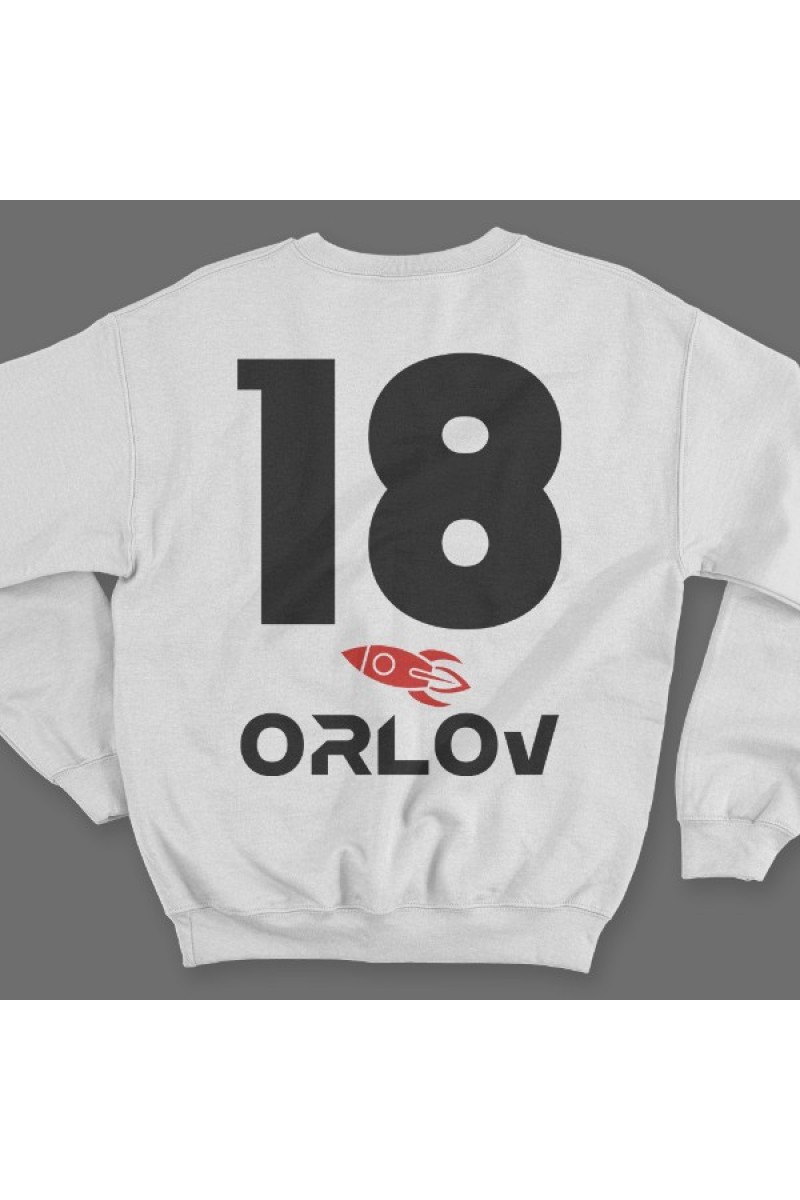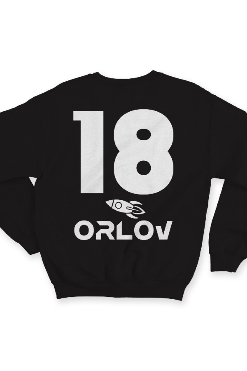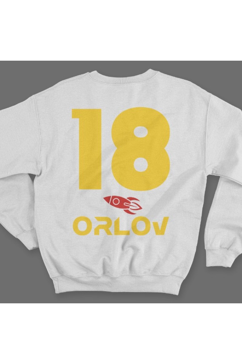 Именной свитшот с космическим шрифтом. Помимо надписи на свитшоте есть изображение ракеты.
